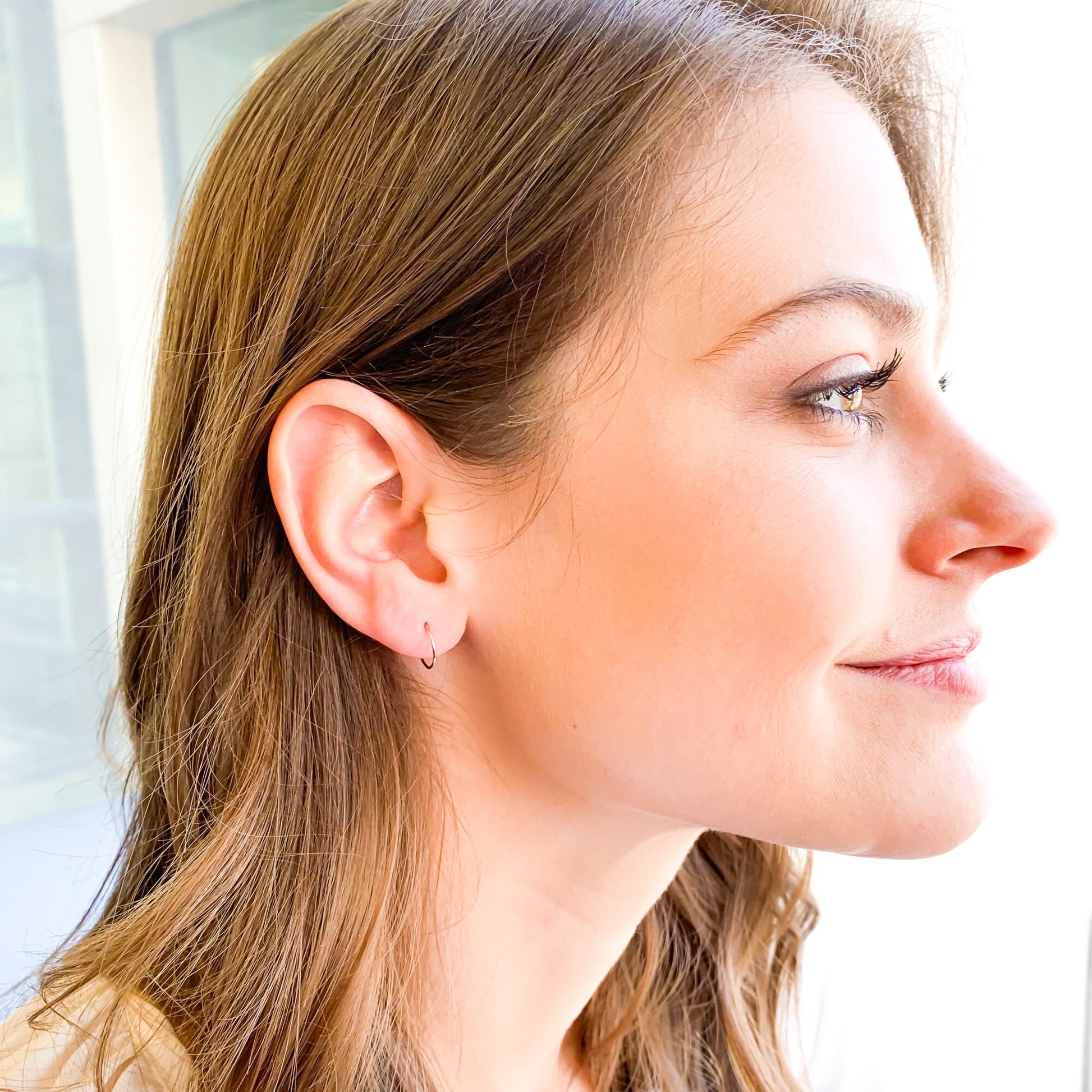 • • • Why choose these 14K gold small hoop earrings? 14K gold is hypoallergenic, and these hoops can be put in and left in—sleeping, showering, running, playing, etc. • • •