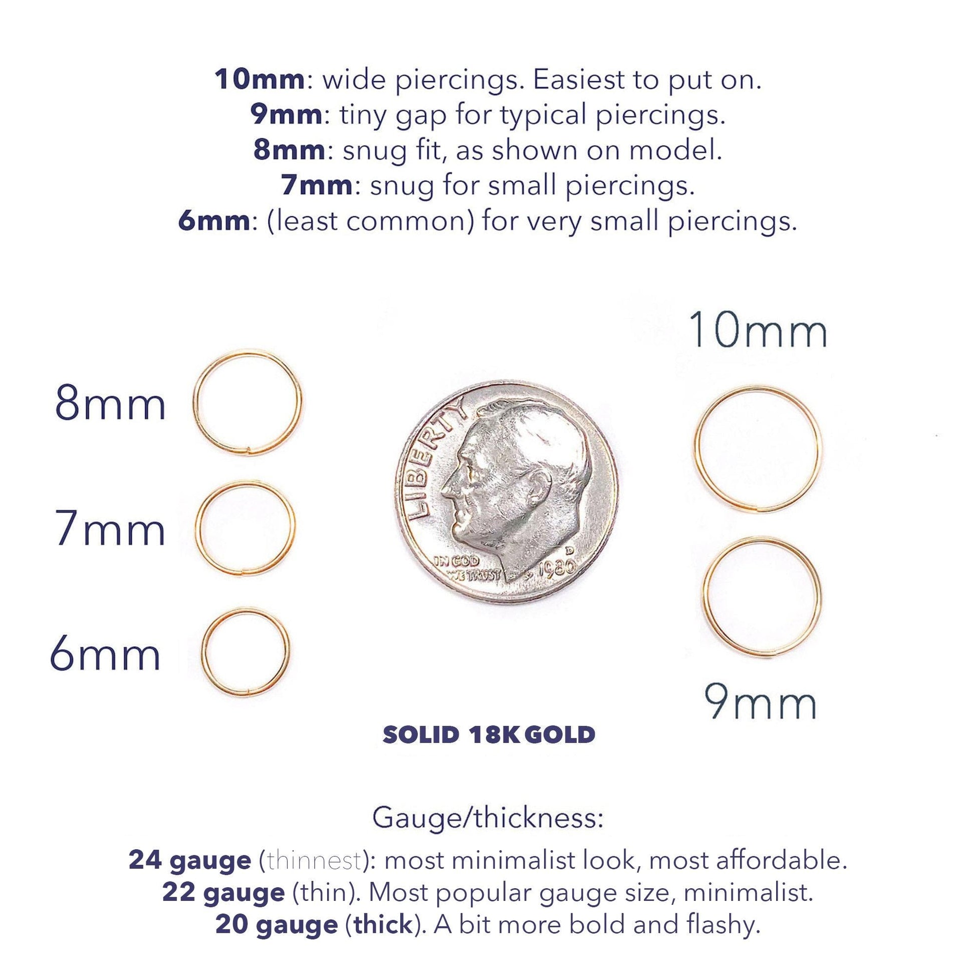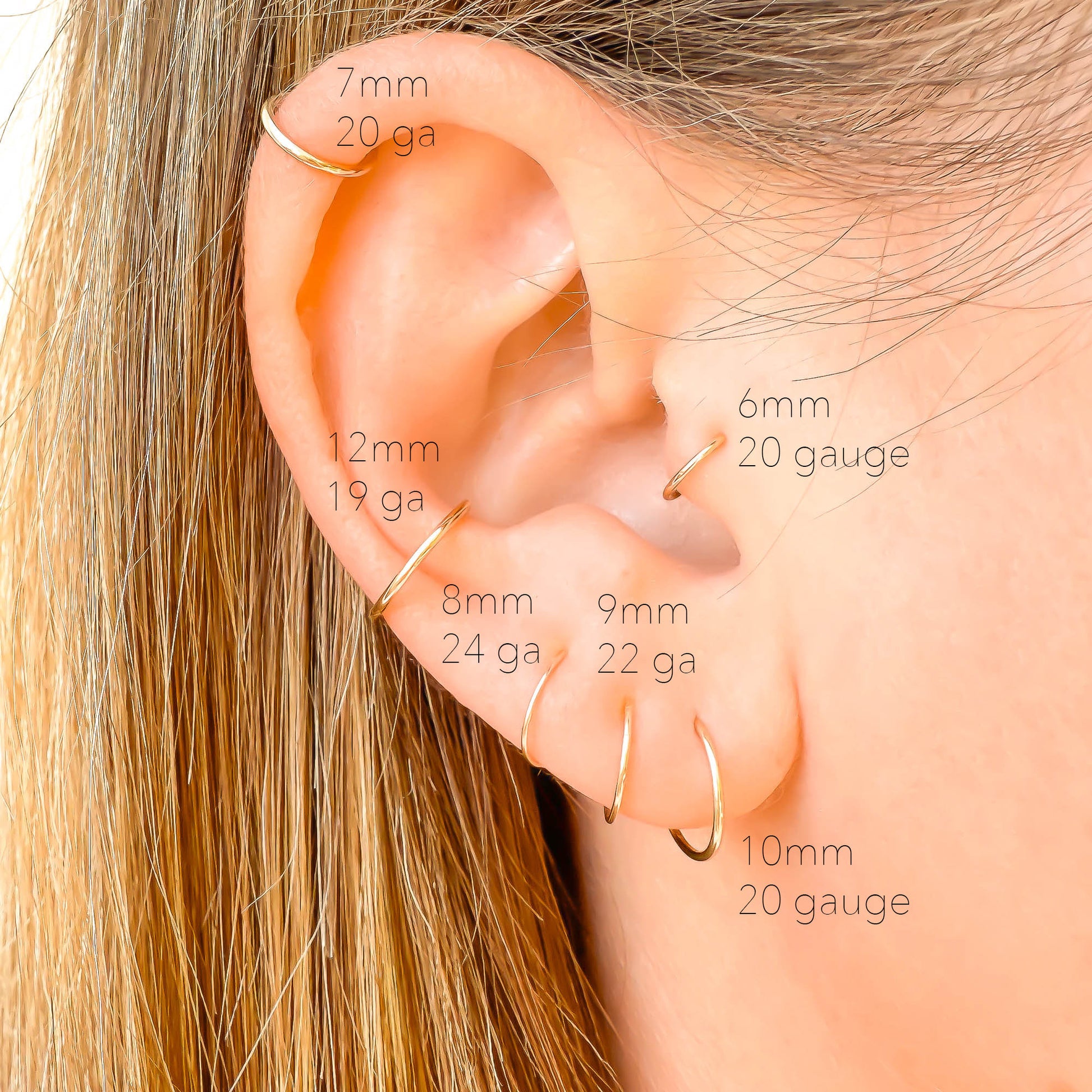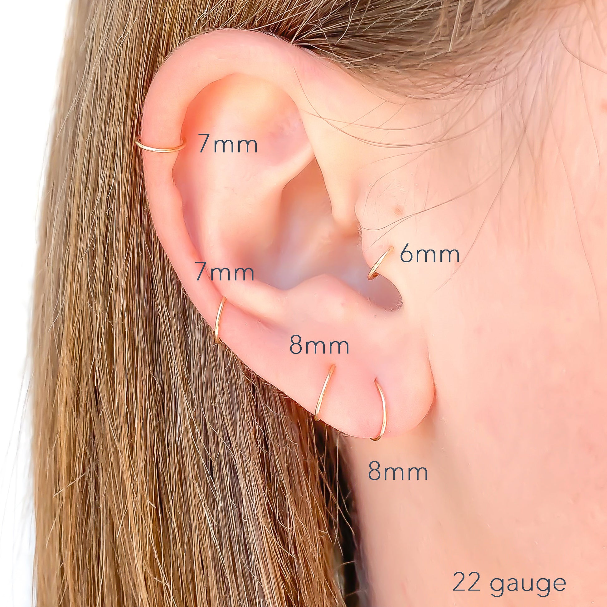 • The model is wearing FIVE separate hoops, 8mm (lobe), 7mm (cartilage), and 6mm (tragus) 22 gauge 18K gold continuous hoop earrings. Also available in 20 gauge.