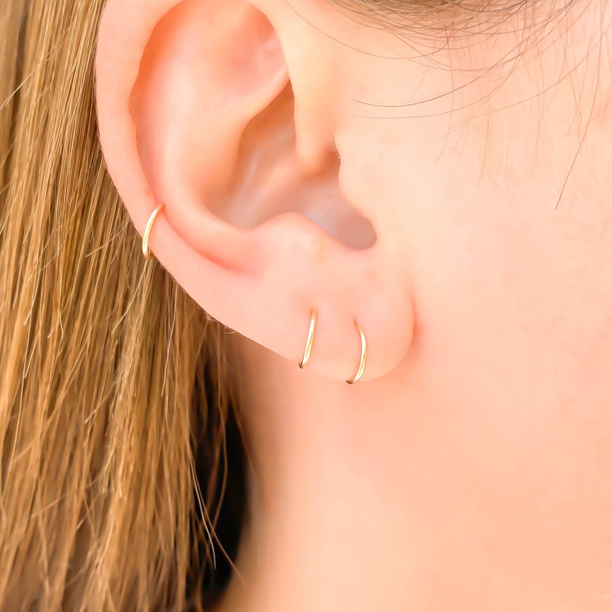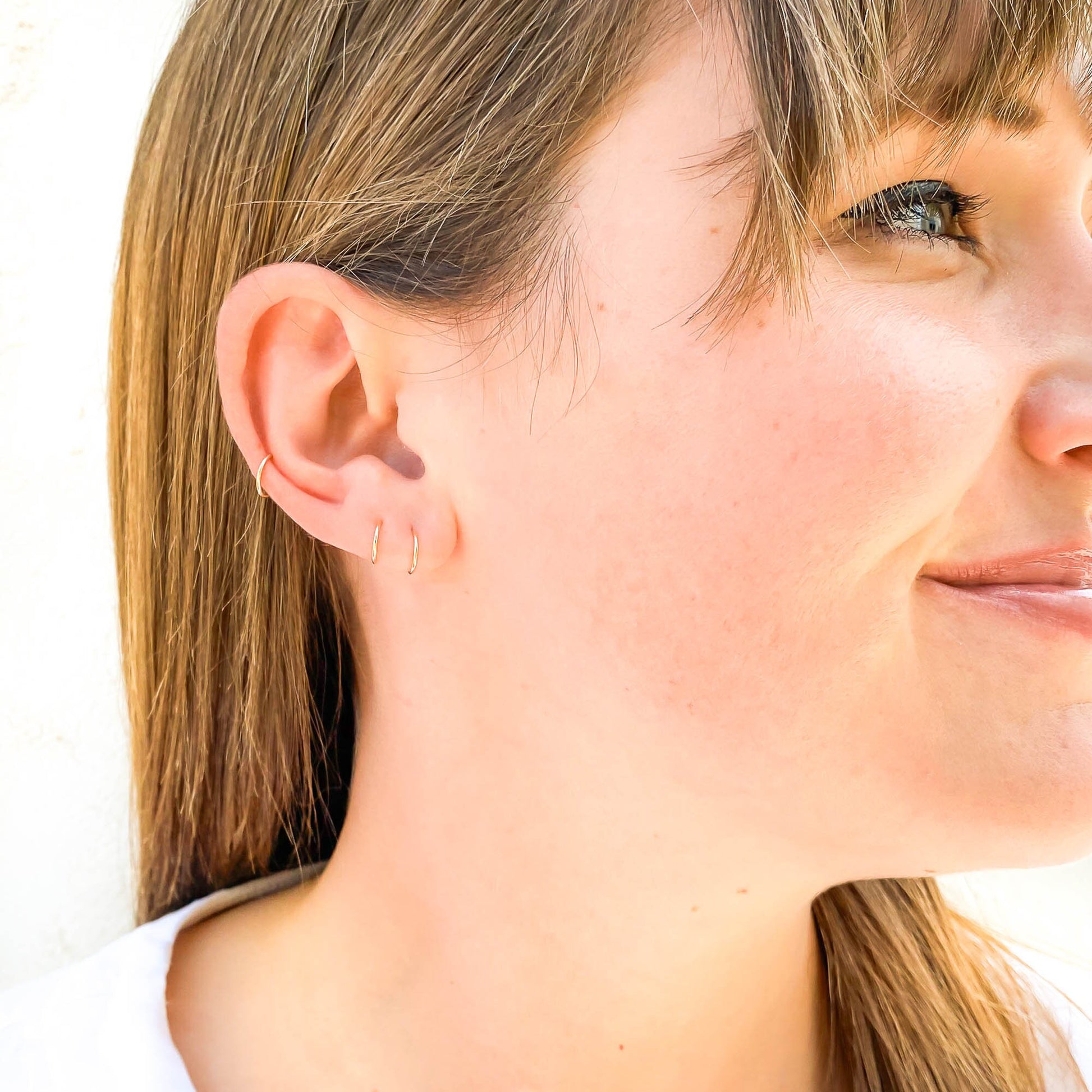 • The model is wearing THREE separate hoops, 8mm (lobe) and 7mm (cartilage) 20 gauge 24K gold continuous hoop earrings.