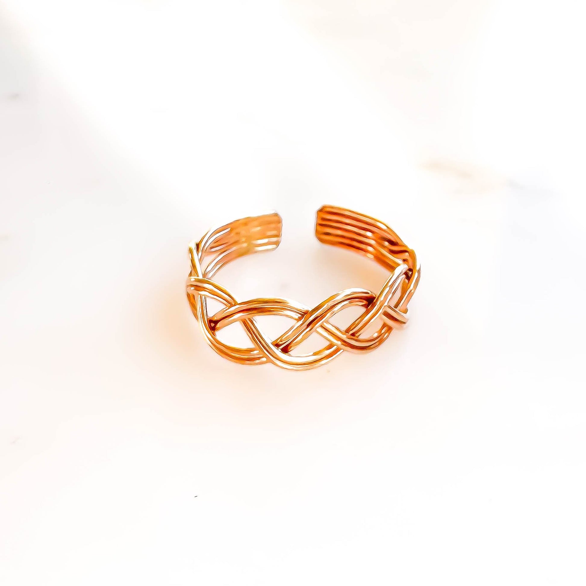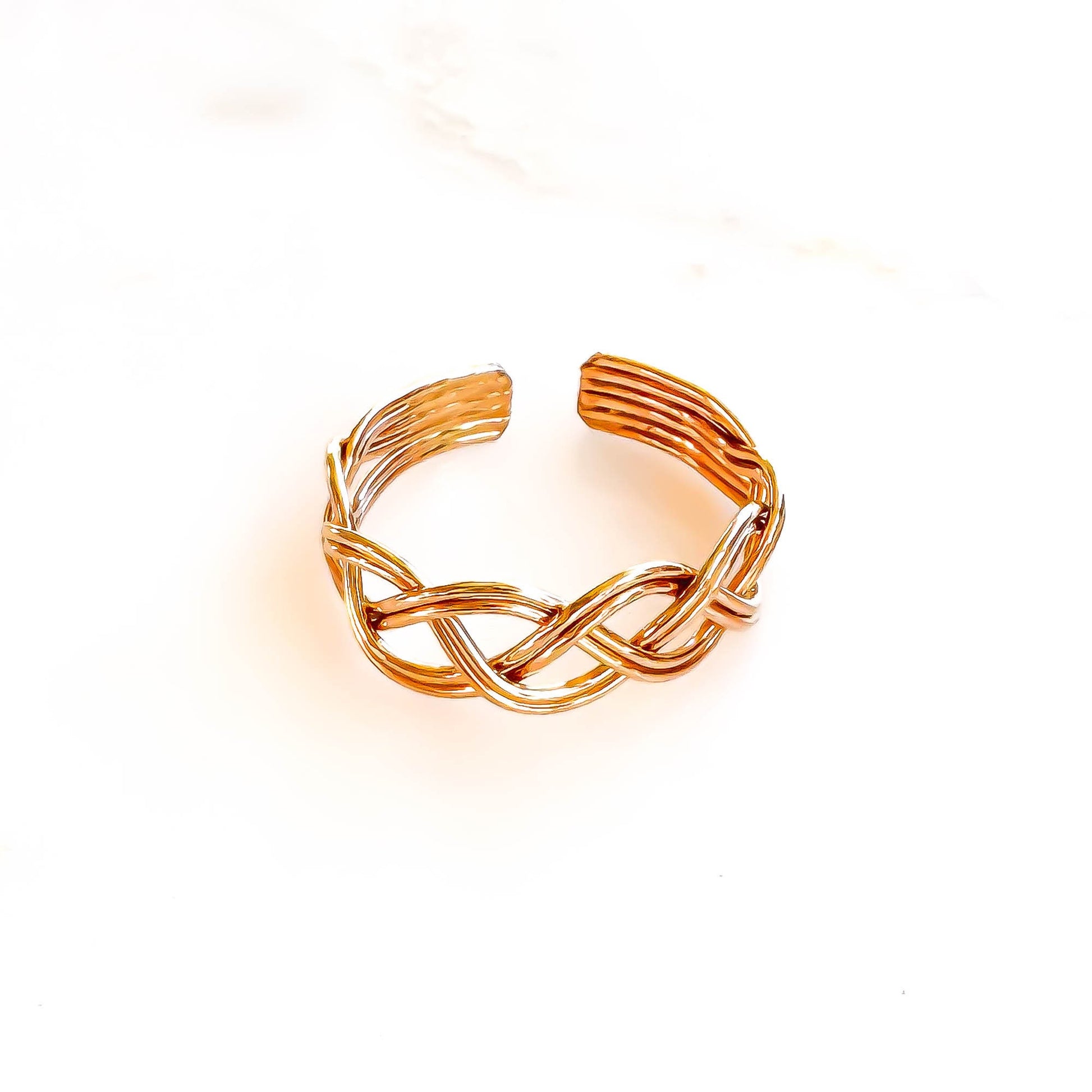 • 5mm wide, 22 gauge round wire, hand braided out of 14K gold filled wire. The braided material is gathered in the back, and soldered flat, for a comfortable fit.