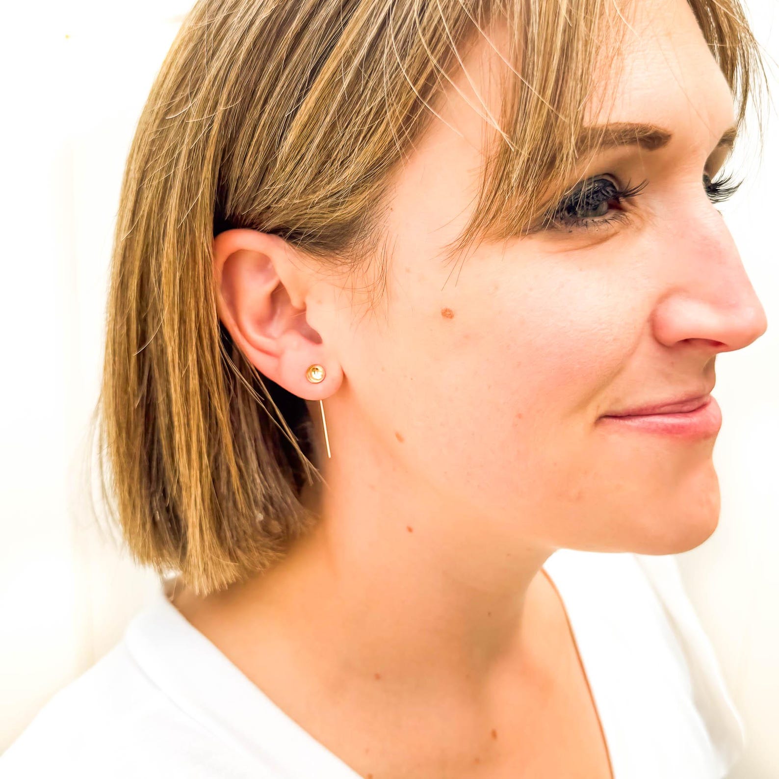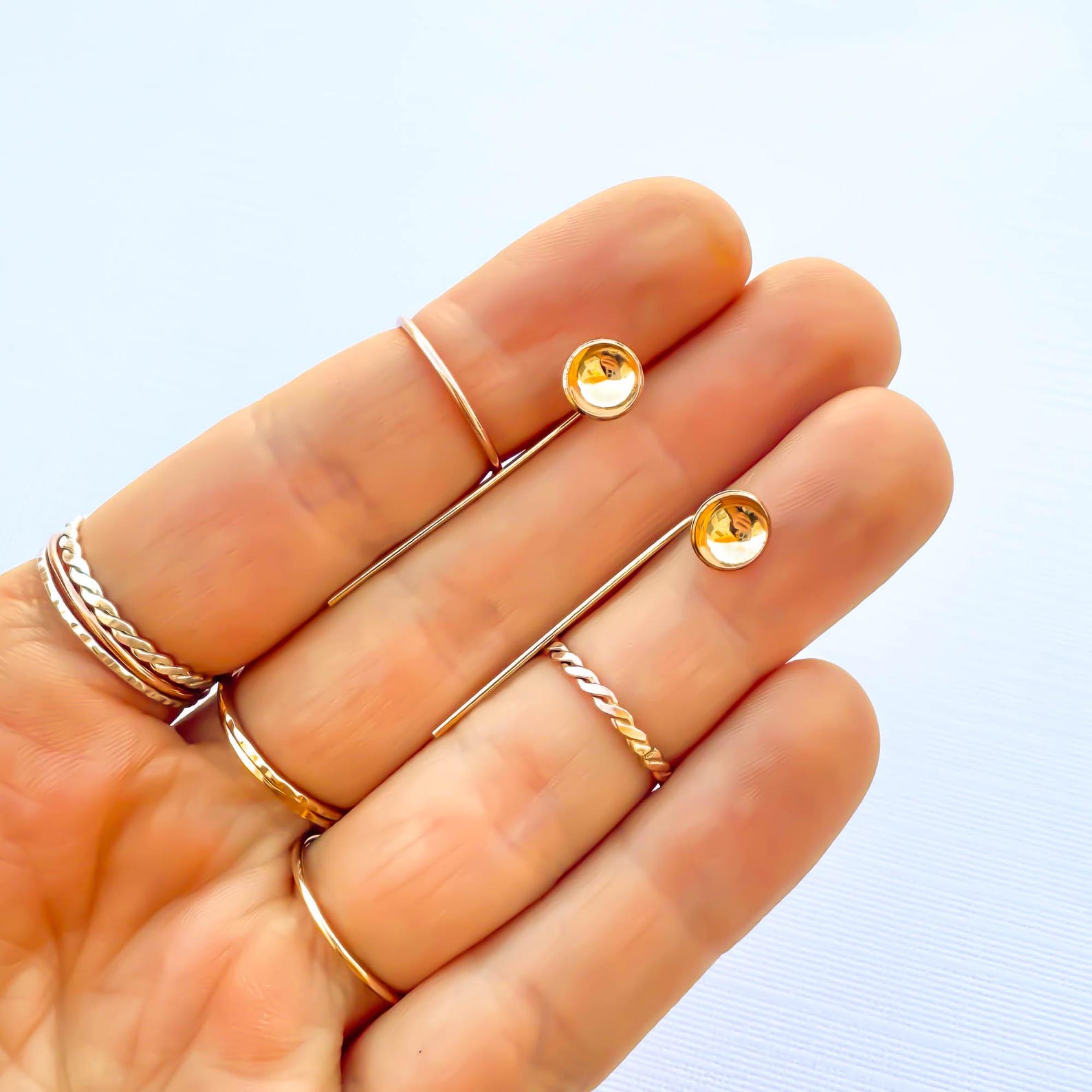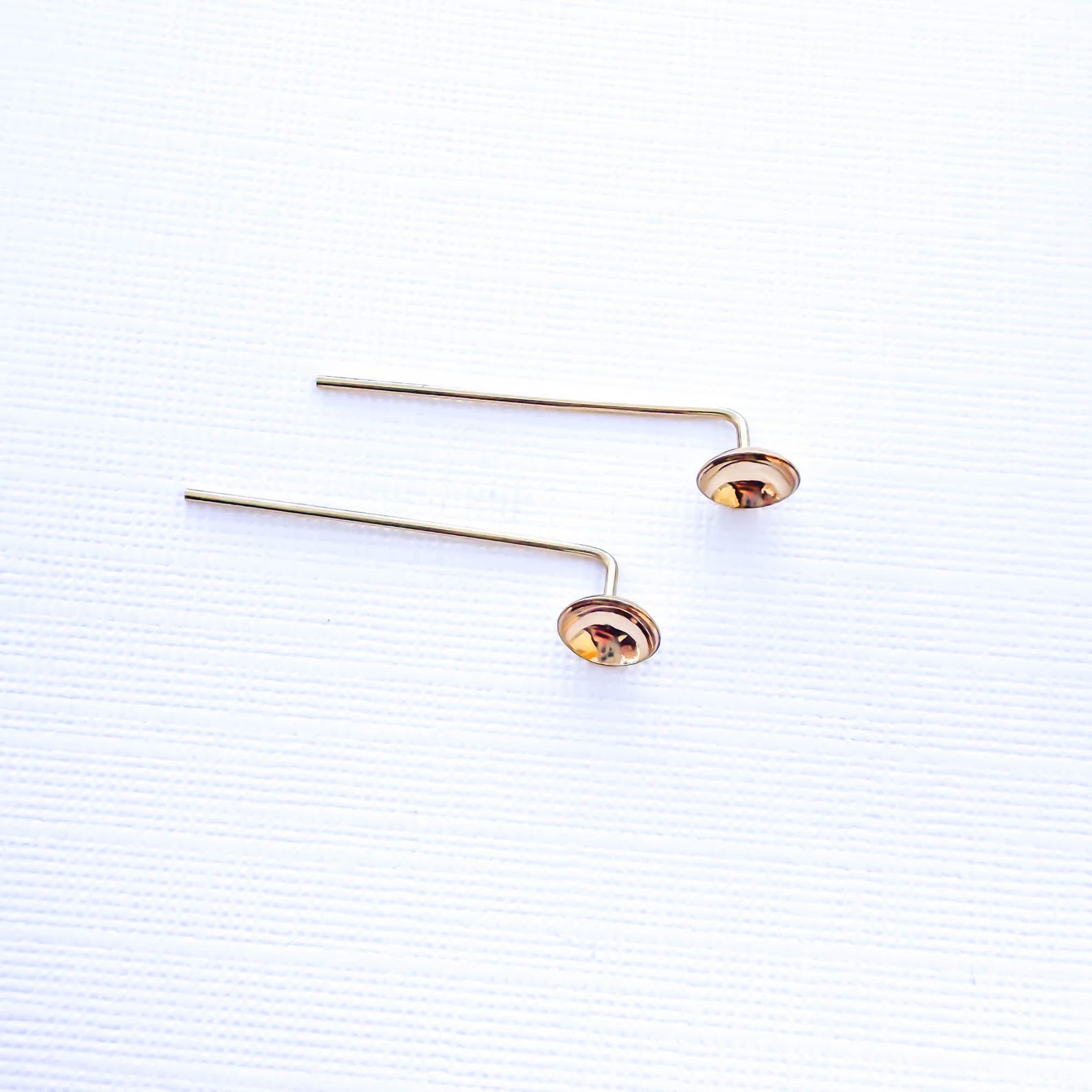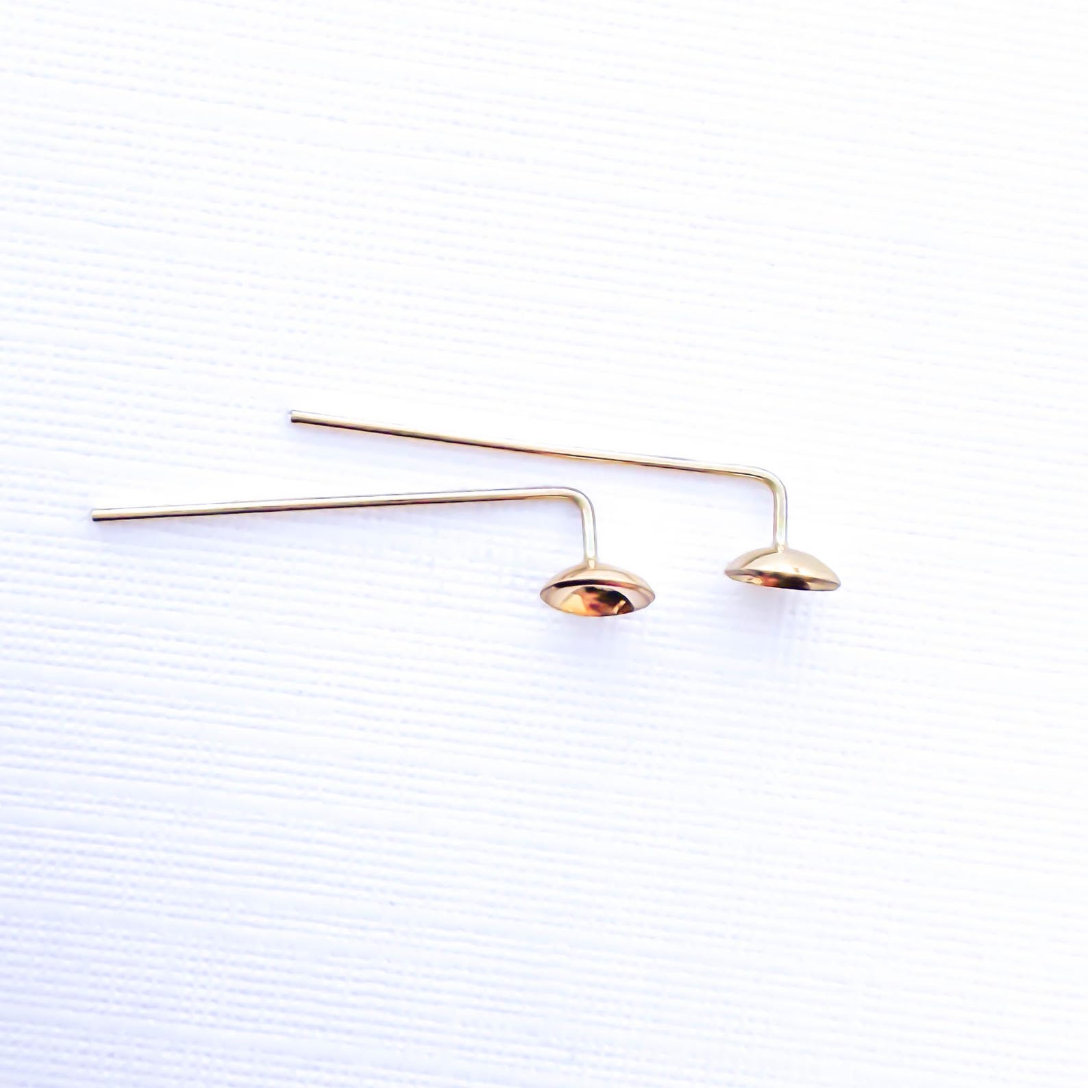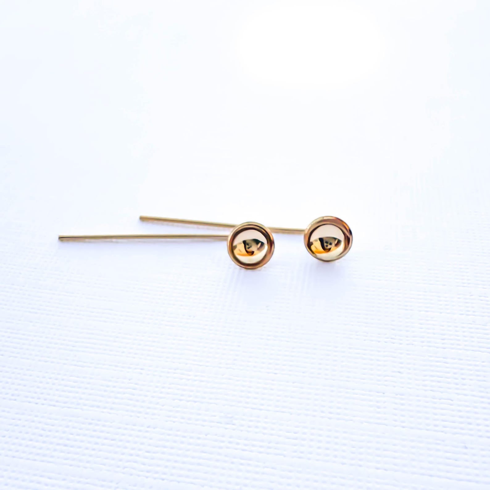 • 14K gold filled cup circle stud threader earrings with a reflective finish.