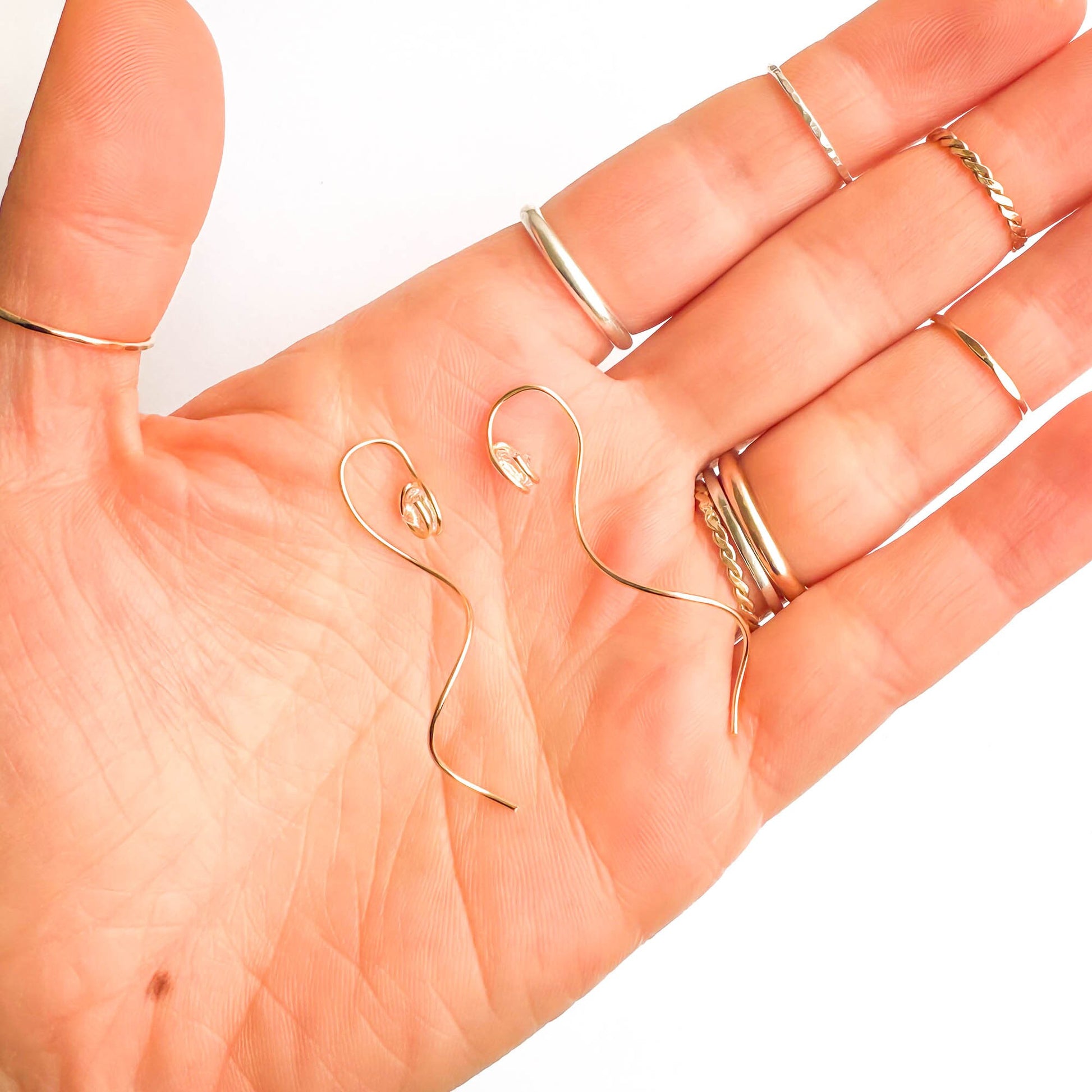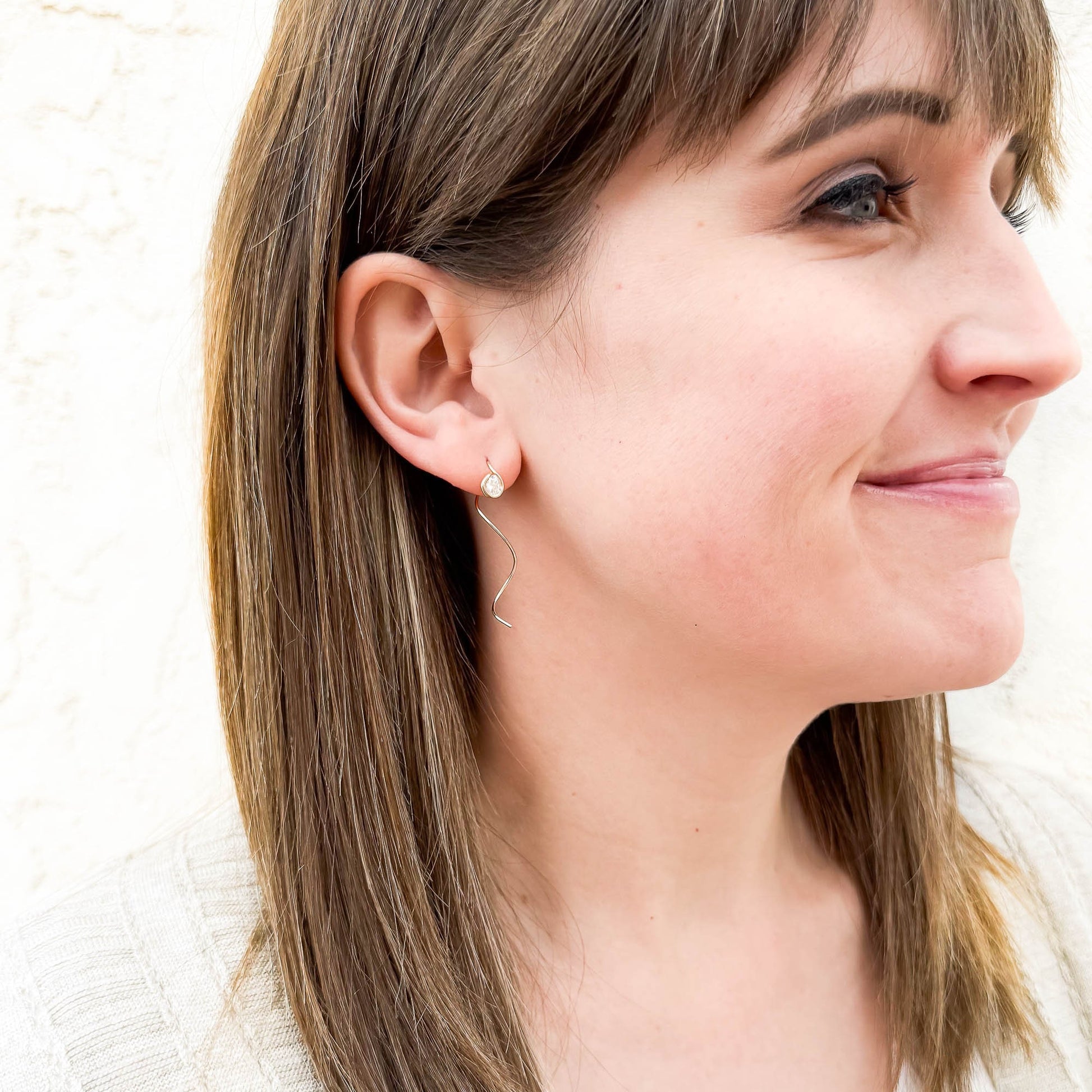 These earrings are sometimes called, “corkscrew” earrings, because you twist them, to insert them. Slip the tip, or bottom of the earring in the front of your piercing, and you pull downwards while gently rotating the earring, until it sits upright in your ear. This fun symmetrical design, is an original creation and truly a one of a kind.