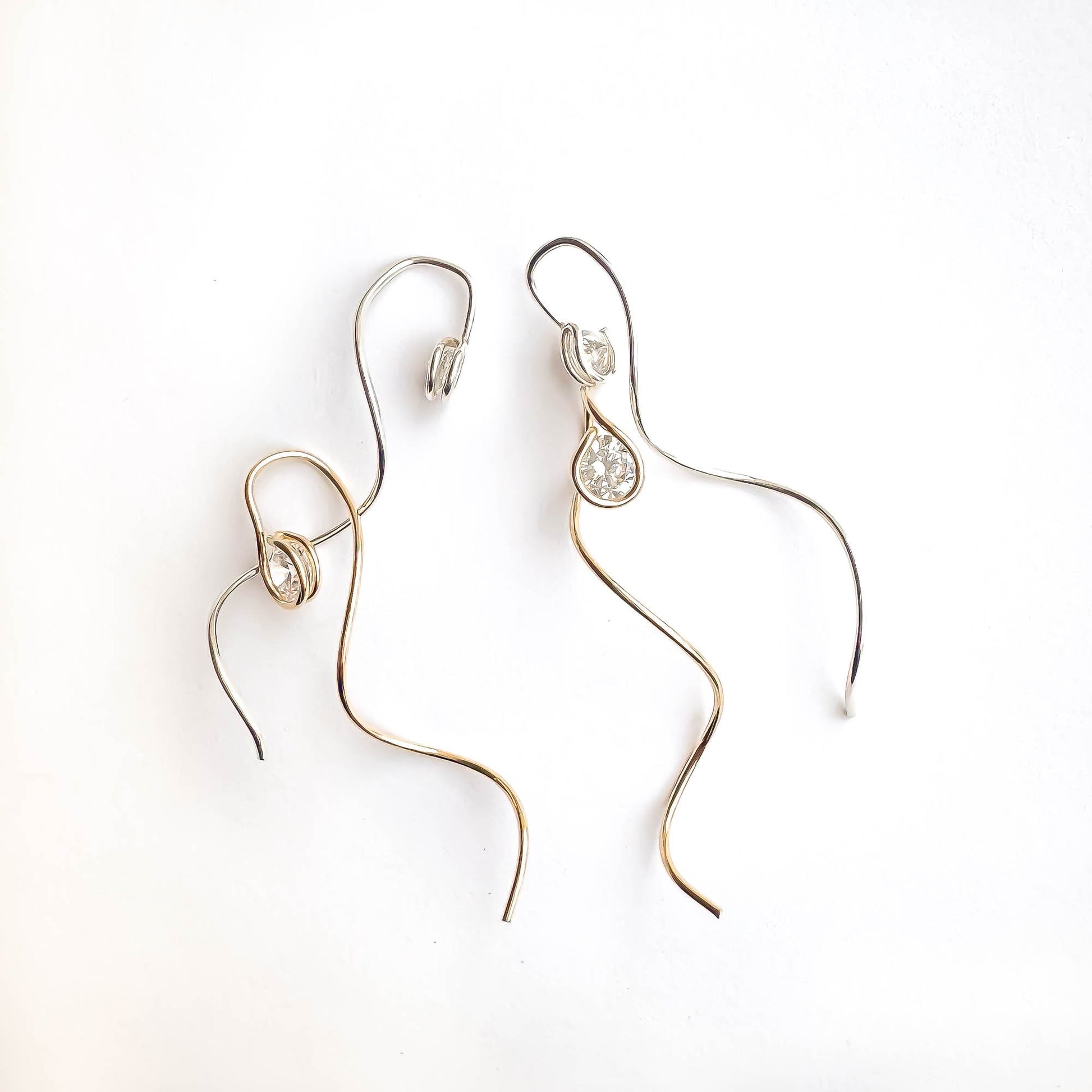 • These elegant drop down spiral earrings are handmade out of 20 gauge wire in 925 sterling silver, with a 5mm CZ or simulated diamond.