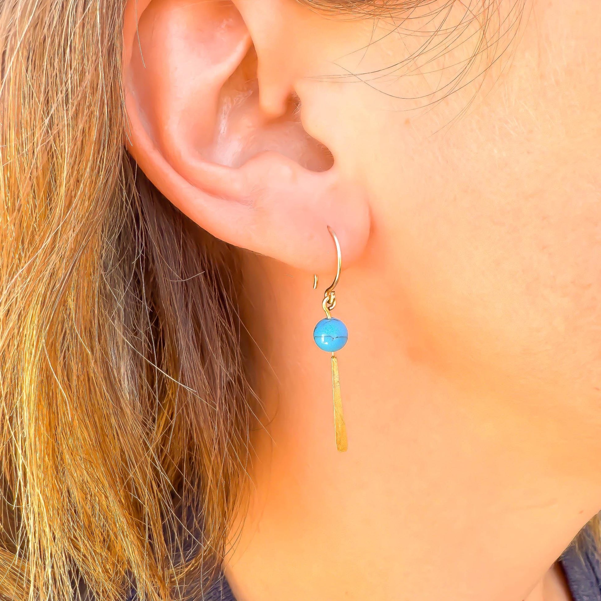 • These elegant drop down earrings feature a brilliant 6mm bead. This bead is a rich royal blue in color, with a matte finish. Each bead is unique. Below the bead is a shimmering golden accent. This earring is free moving which creates a sleek and glimmering statement.