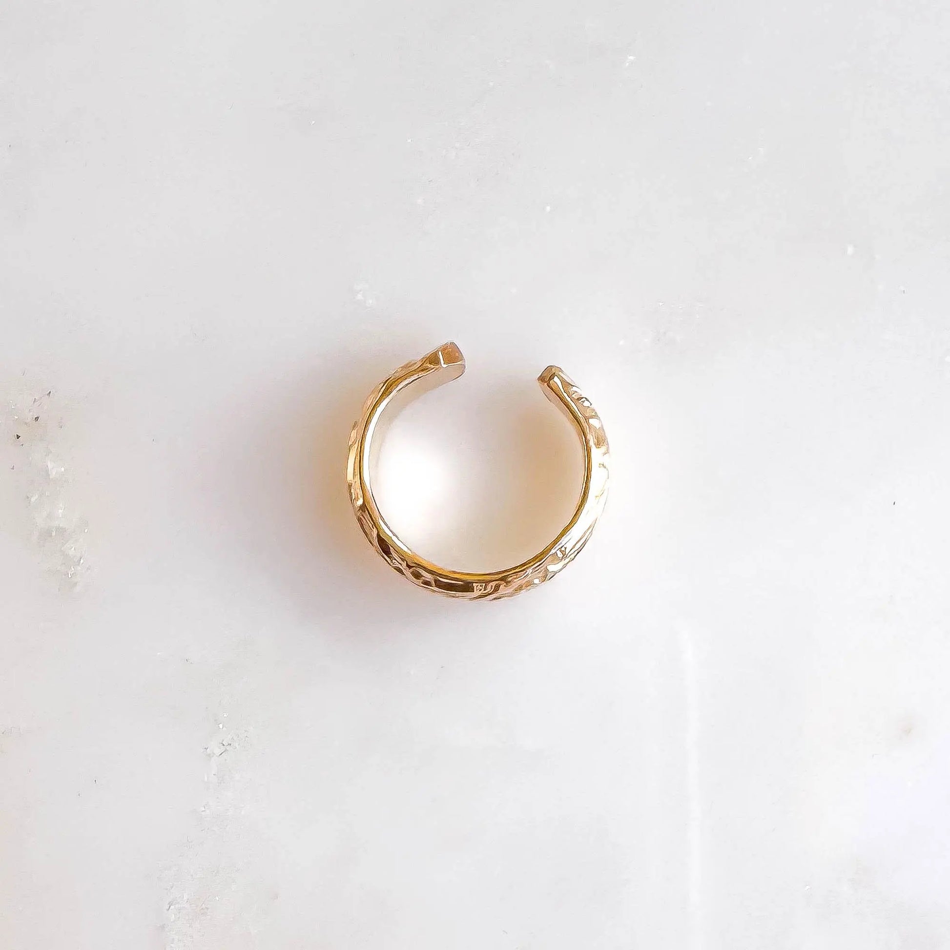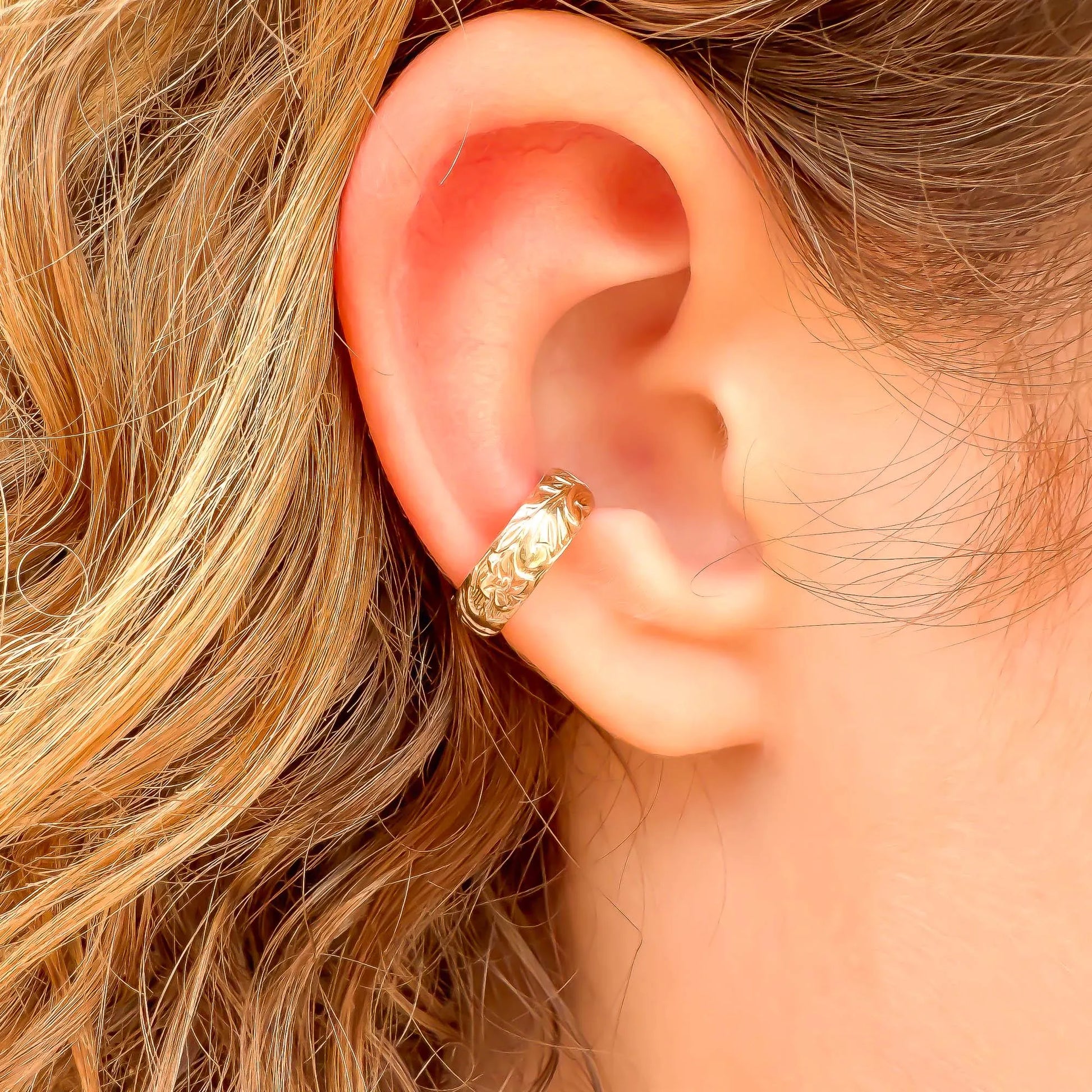 This is a thick ear cuff in 14K gold filled. It has an engraved, elegant and unique blend of floral and leaf designs.