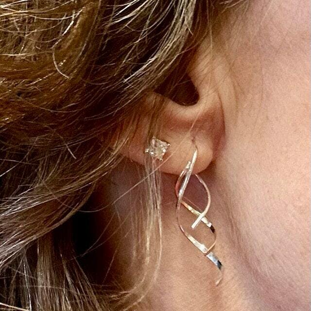 Spiral earrings have been continuous best sellers for decades because of their unique and sleek design. Slip these earrings in by twisting in the shorter end through the front of your lobe, until it sits upright in your ear. This twisting motion is often why these are called corkscrew earrings.
