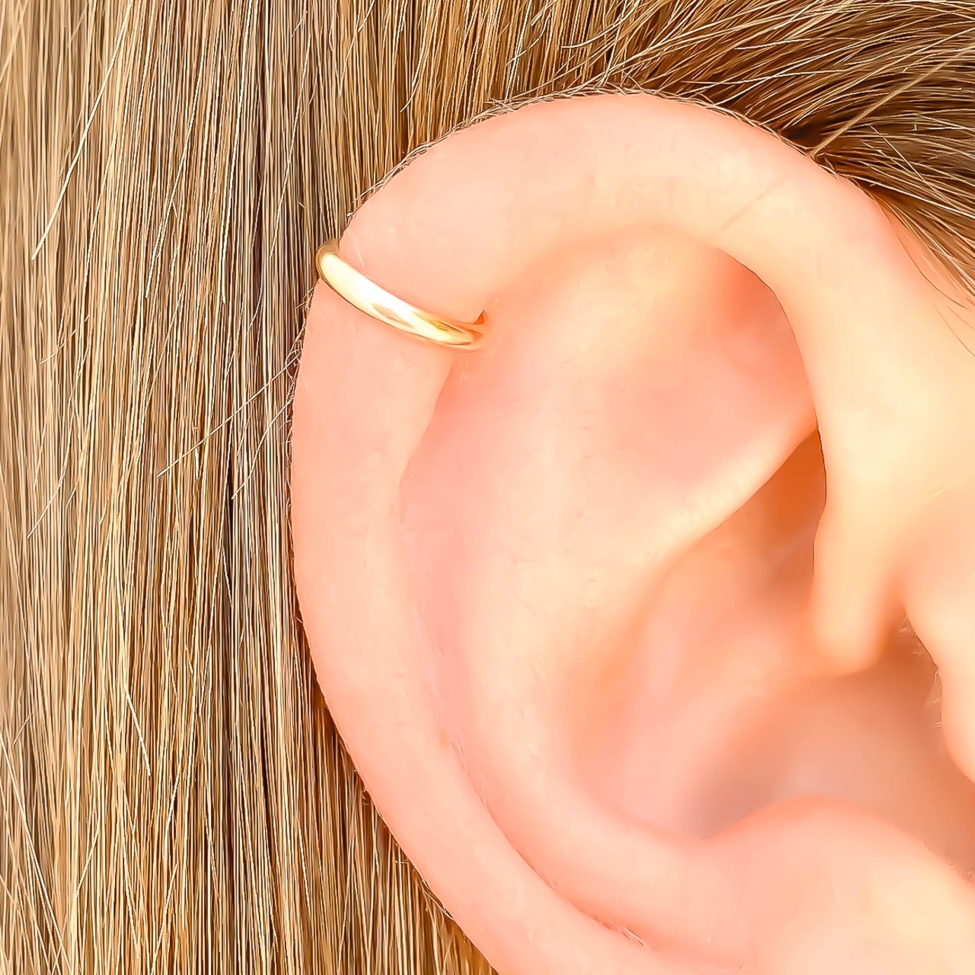 A half round gold filled ear cuff, means that it has a domed surface, with a backing that is flat. The flat inside of the ear cuff lays flat against your ear, making it lightweight and comfortable. The rounded surfaces bounces off light, causing this to be a subtle, classy look.
