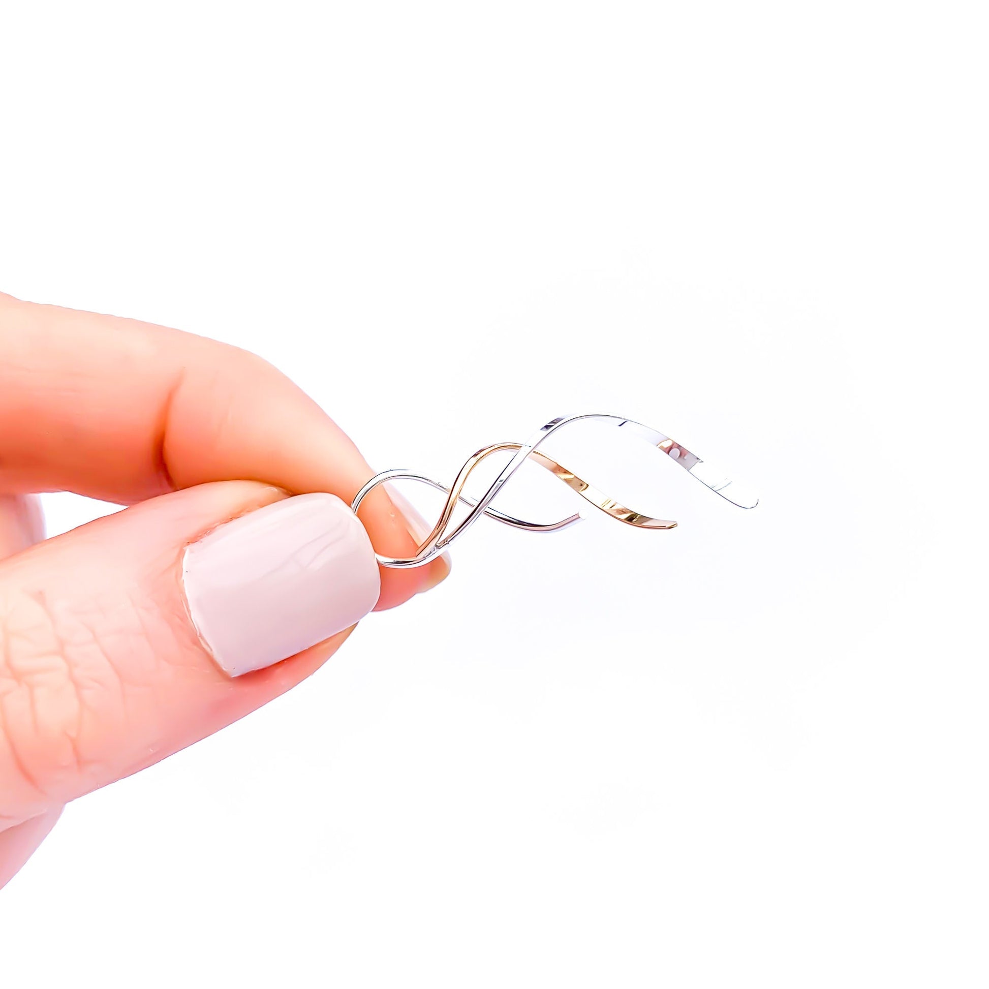 These earrings are sometimes called, “corkscrew” earrings, because you twist them, to insert them. The shorter and round end slips through the front of your piercing, and you pull downwards while gently rotating the earring, until it sits upright in your ear. This fun symmetrical design, is an original creation and truly a one of a kind. It’s a popular gift, and a classic wardrobe staple.