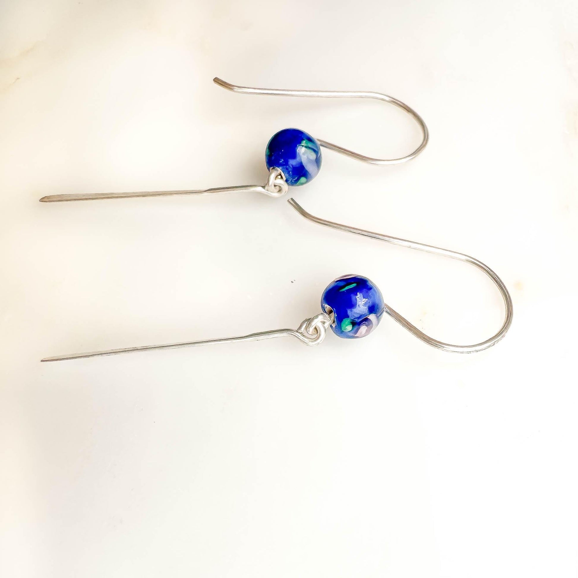 • These elegant drop down earrings feature a brilliant 6.5mm bead. This glass bead is hand crafted with a delicate design of blue, pink, and green swirls to form a floral pattern. Each bead is unique. Below the bead is a shimmering sliver accent. This earring is free moving which creates a sleek and glimmering statement.
