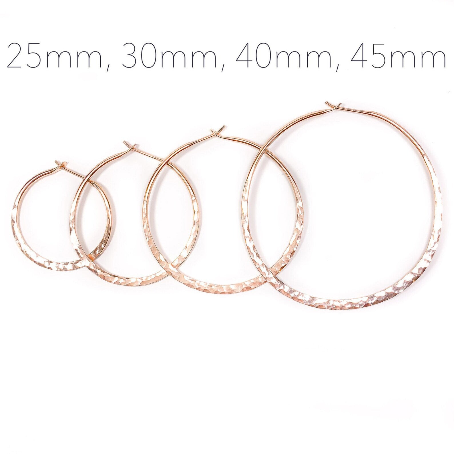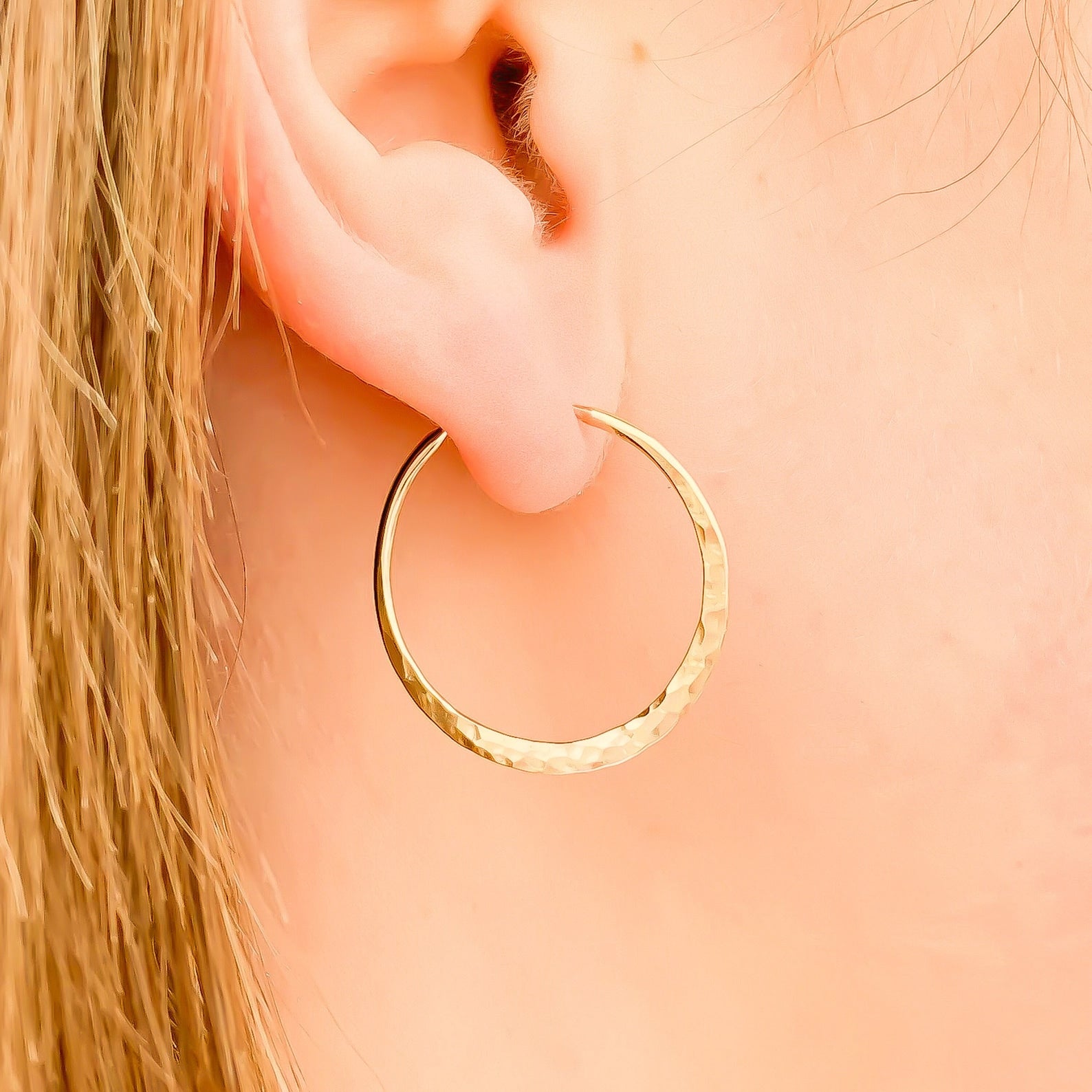 These hoops are designed to be lightweight, but also durable. Each hoop is hand hammered to give extra shine, texture, and a unique look. In the pictures, our model is wearing size 25mm.