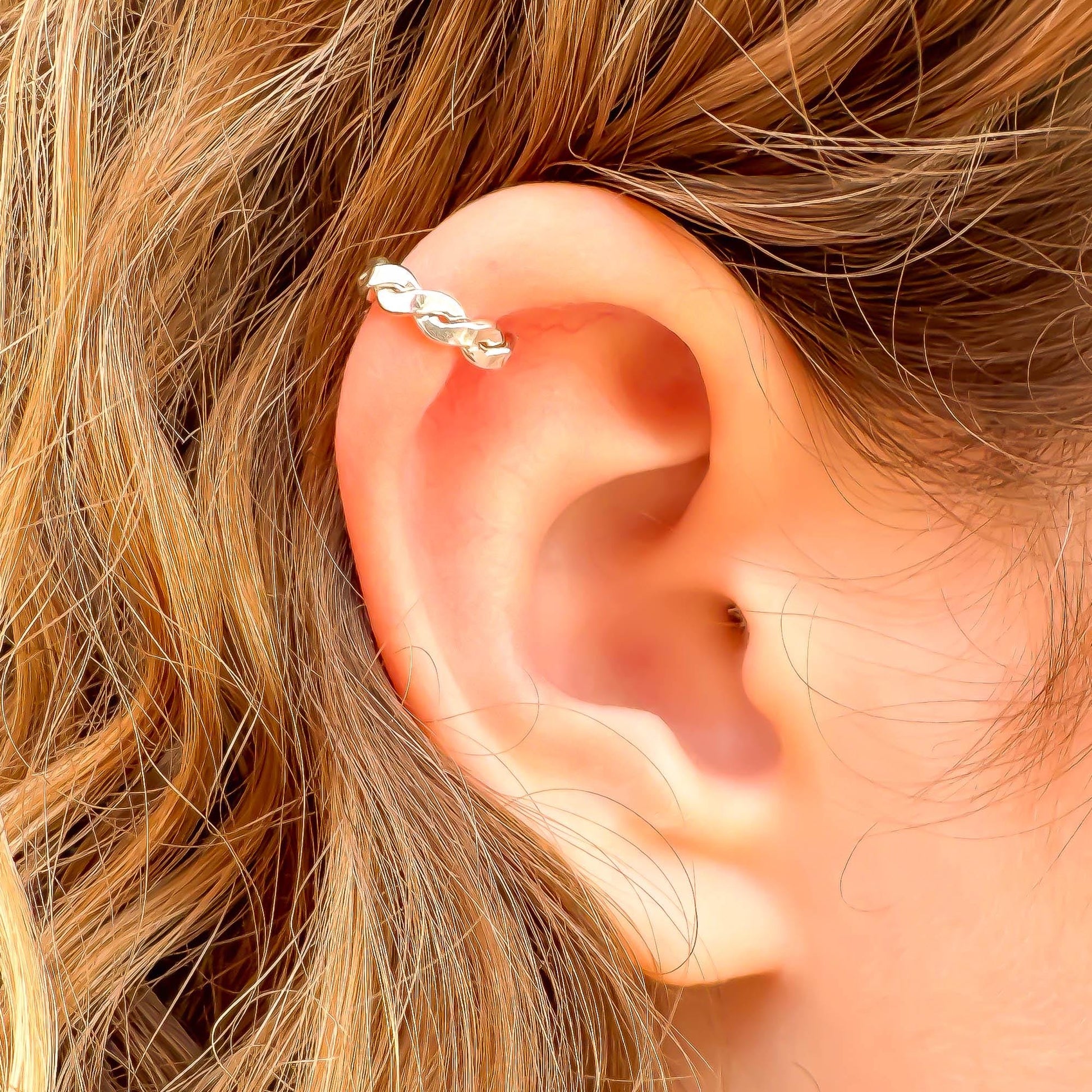 This is a dainty ear cuff in solid sterling silver. It has an elegant, unique twist and flattened design.