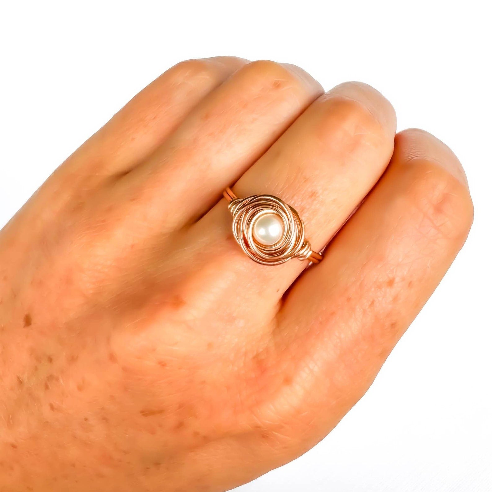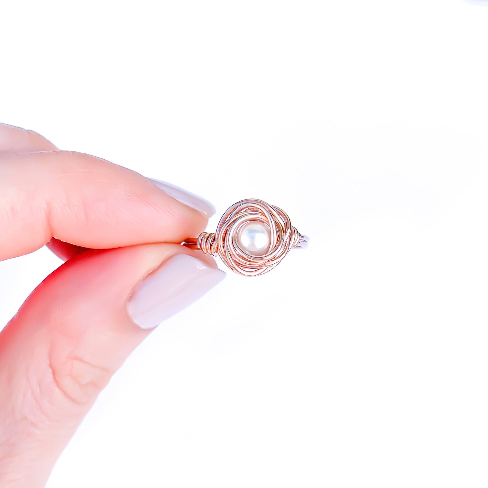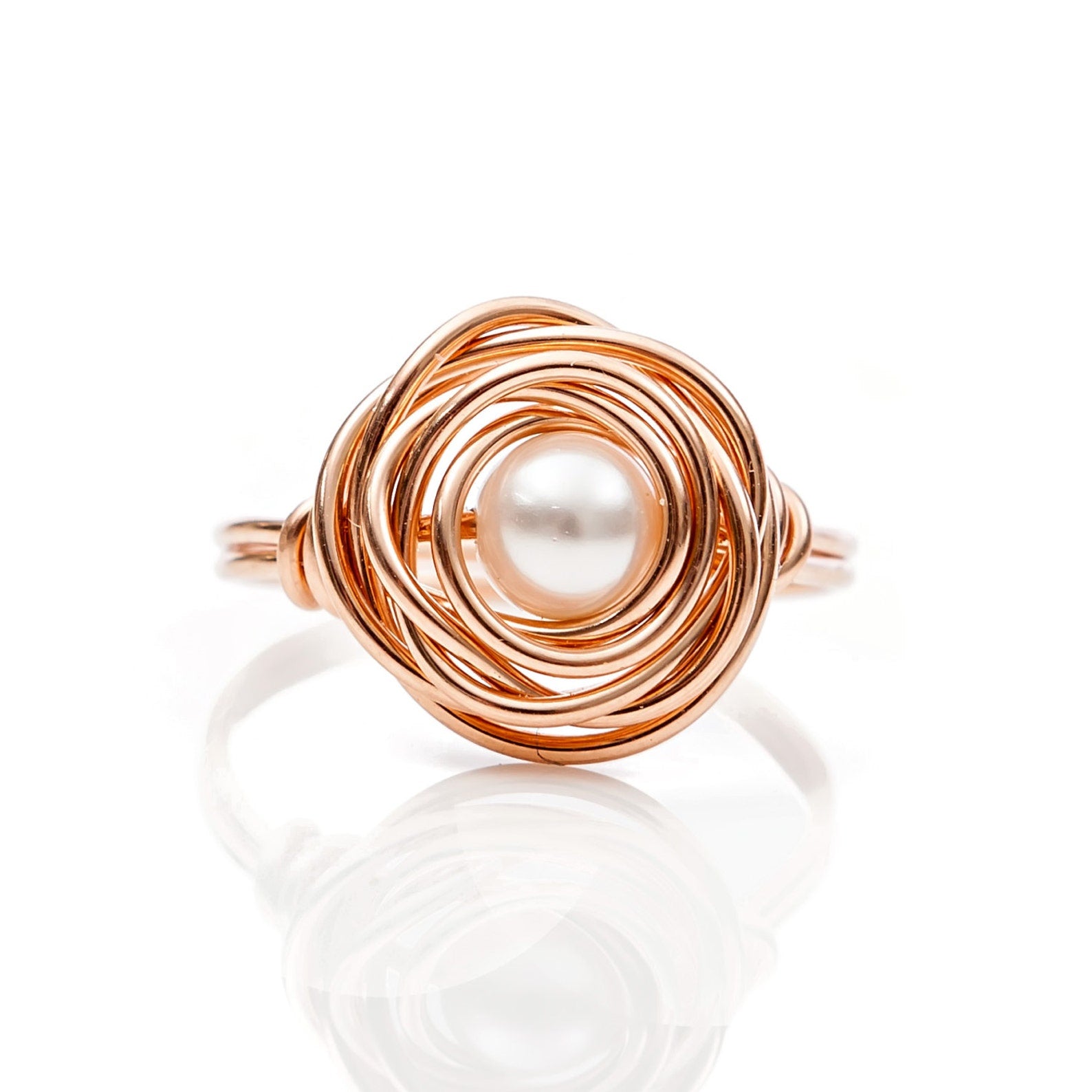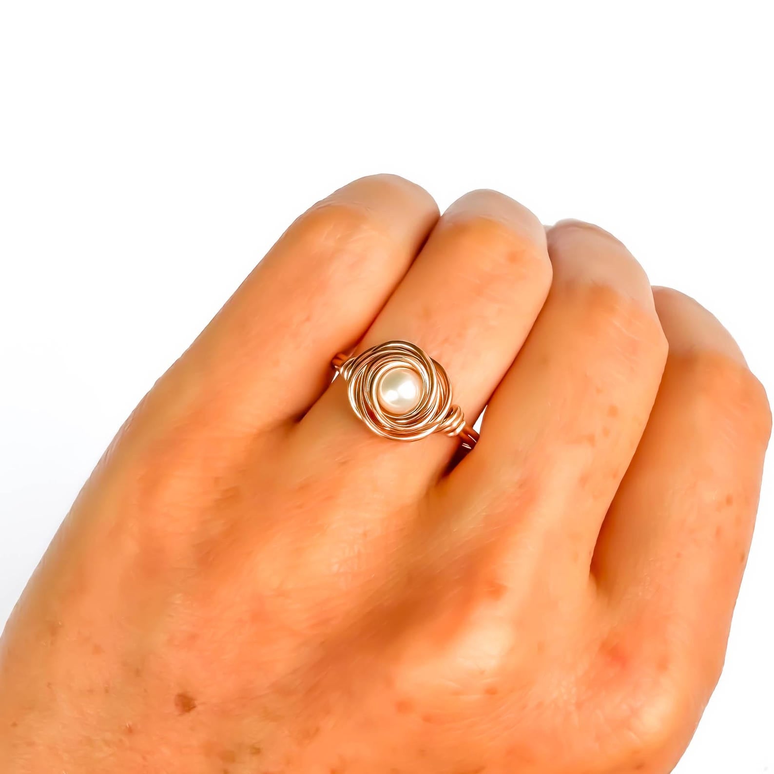 • Handcrafted out of 20 gauge 14K rose gold filled wire with a Czech glass pearl. The design is to resemble a nest, or a rose, with a pearl.