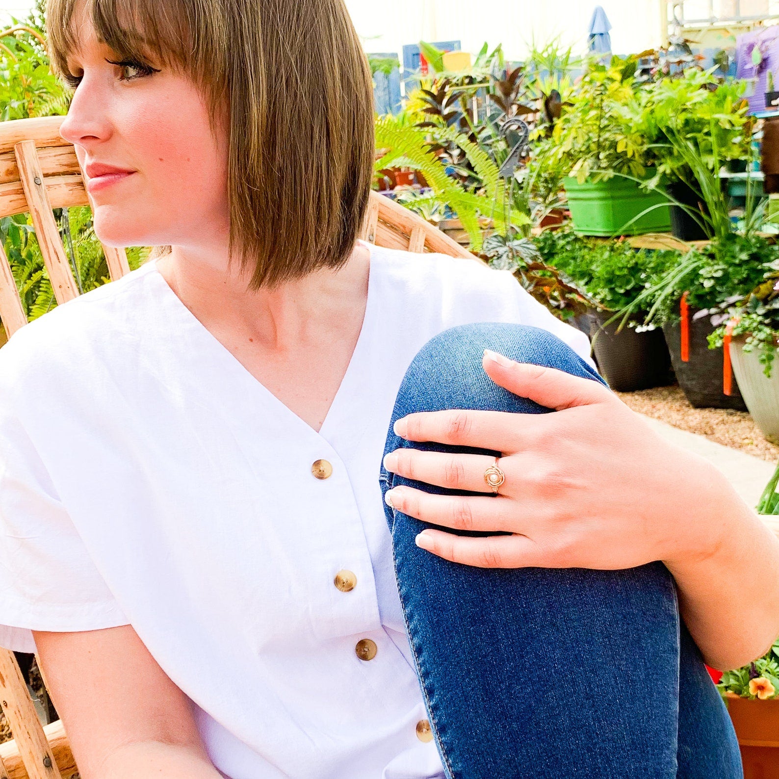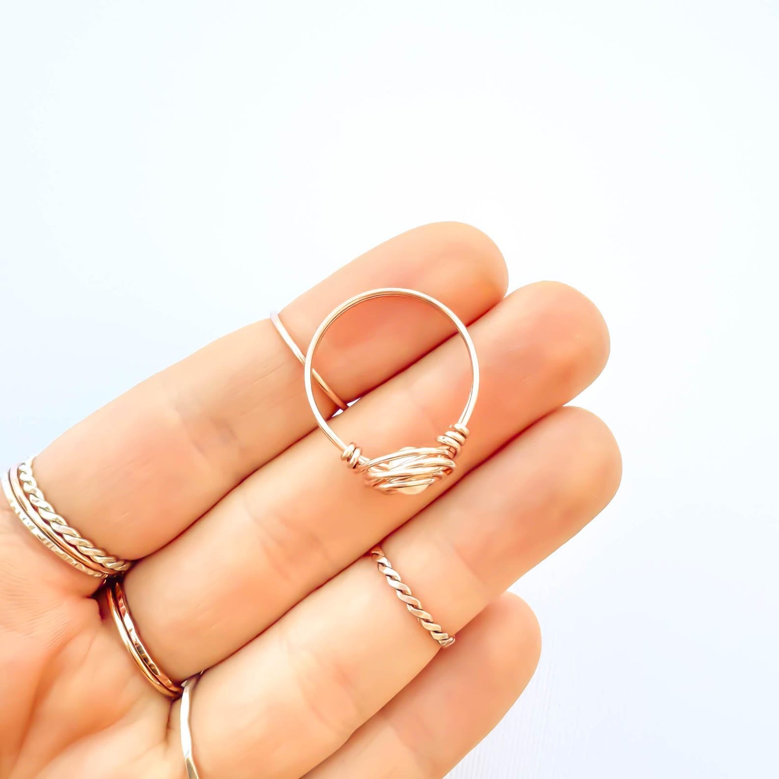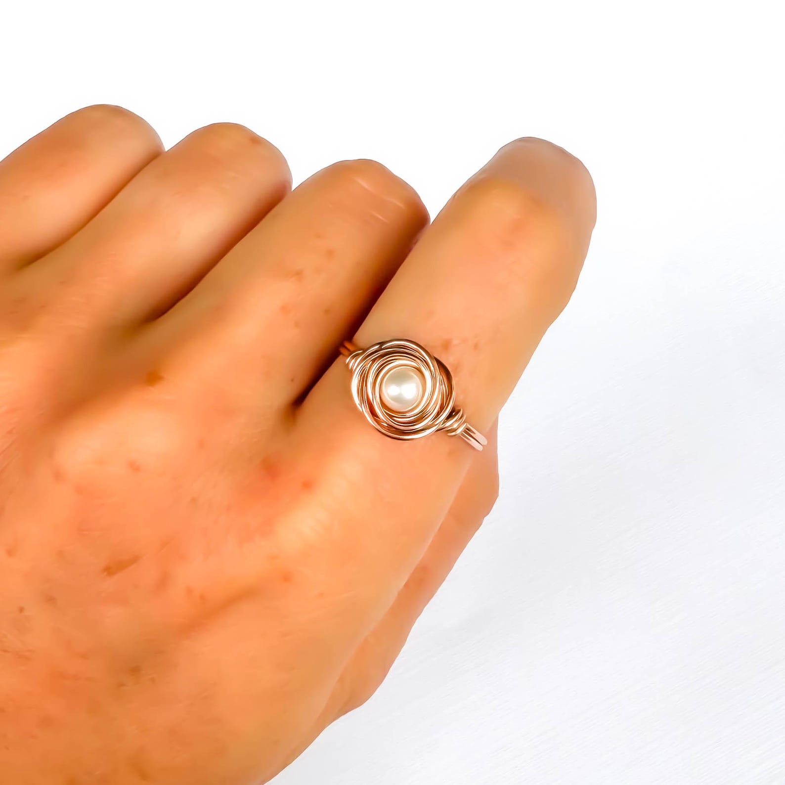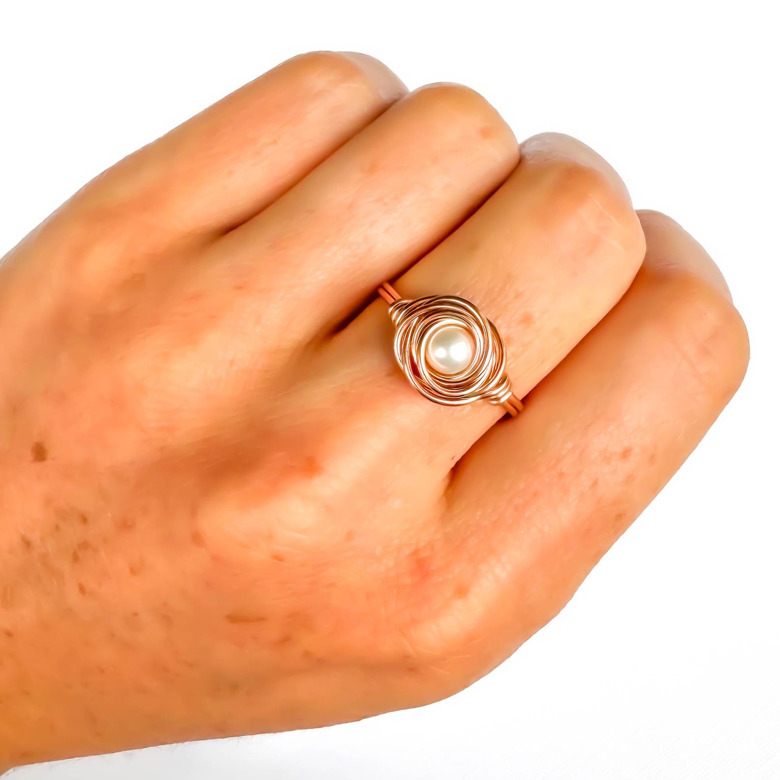 • Handcrafted out of 20 gauge 14K rose gold filled wire with a Czech glass pearl. The design is to resemble a nest, or a rose, with a pearl.