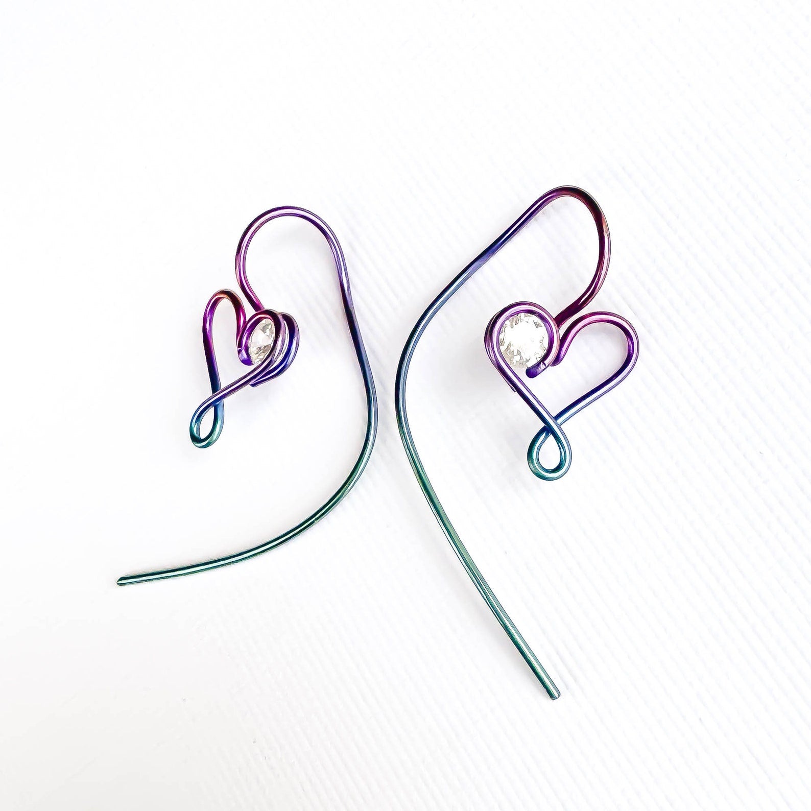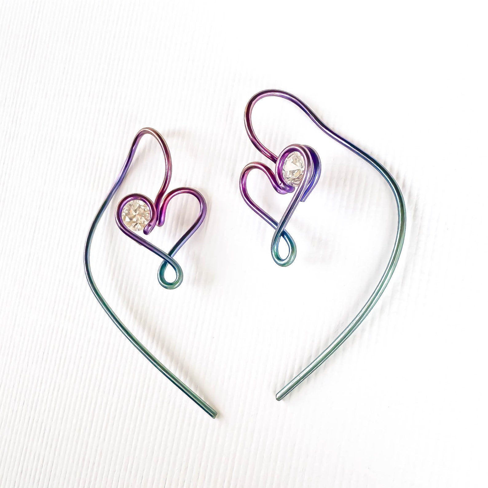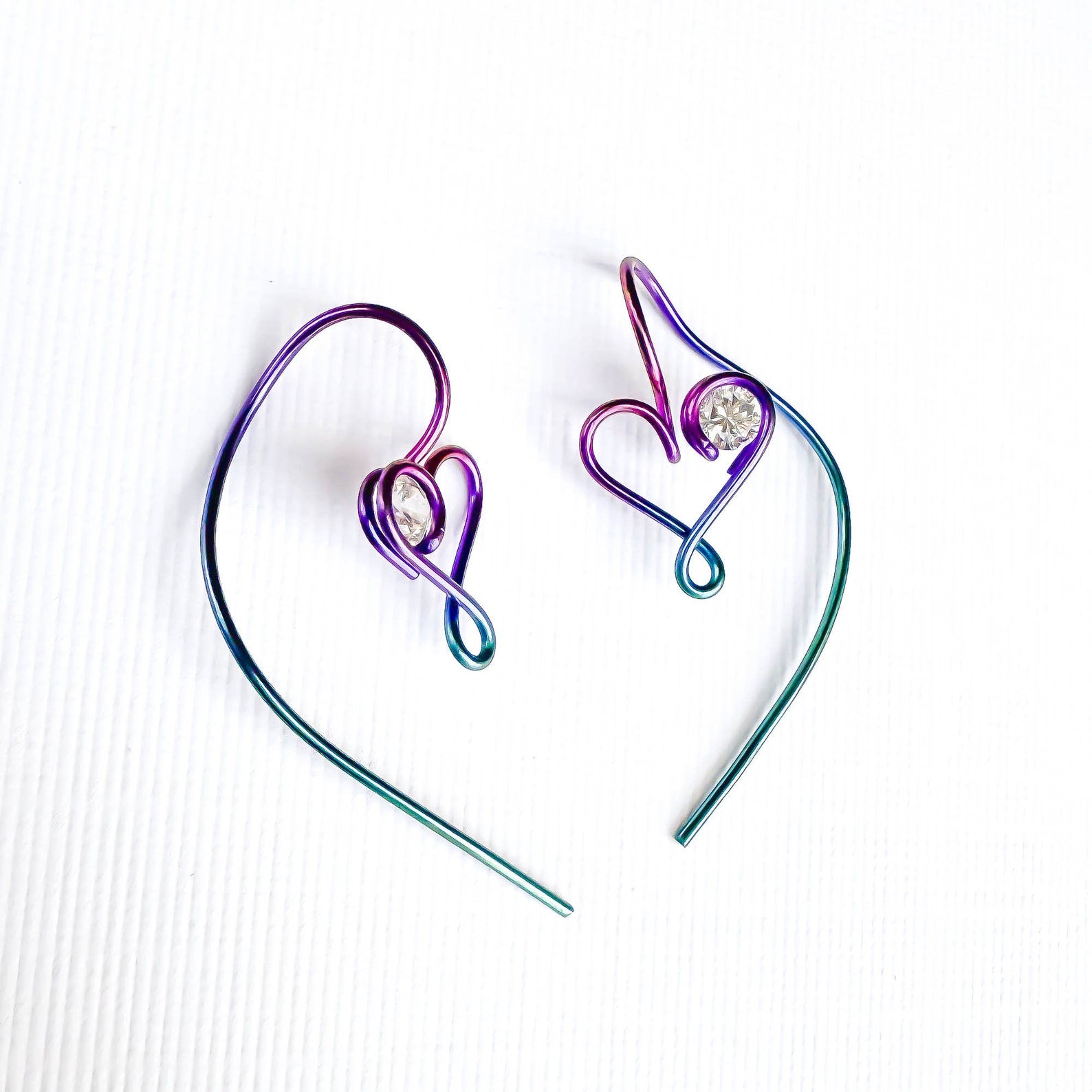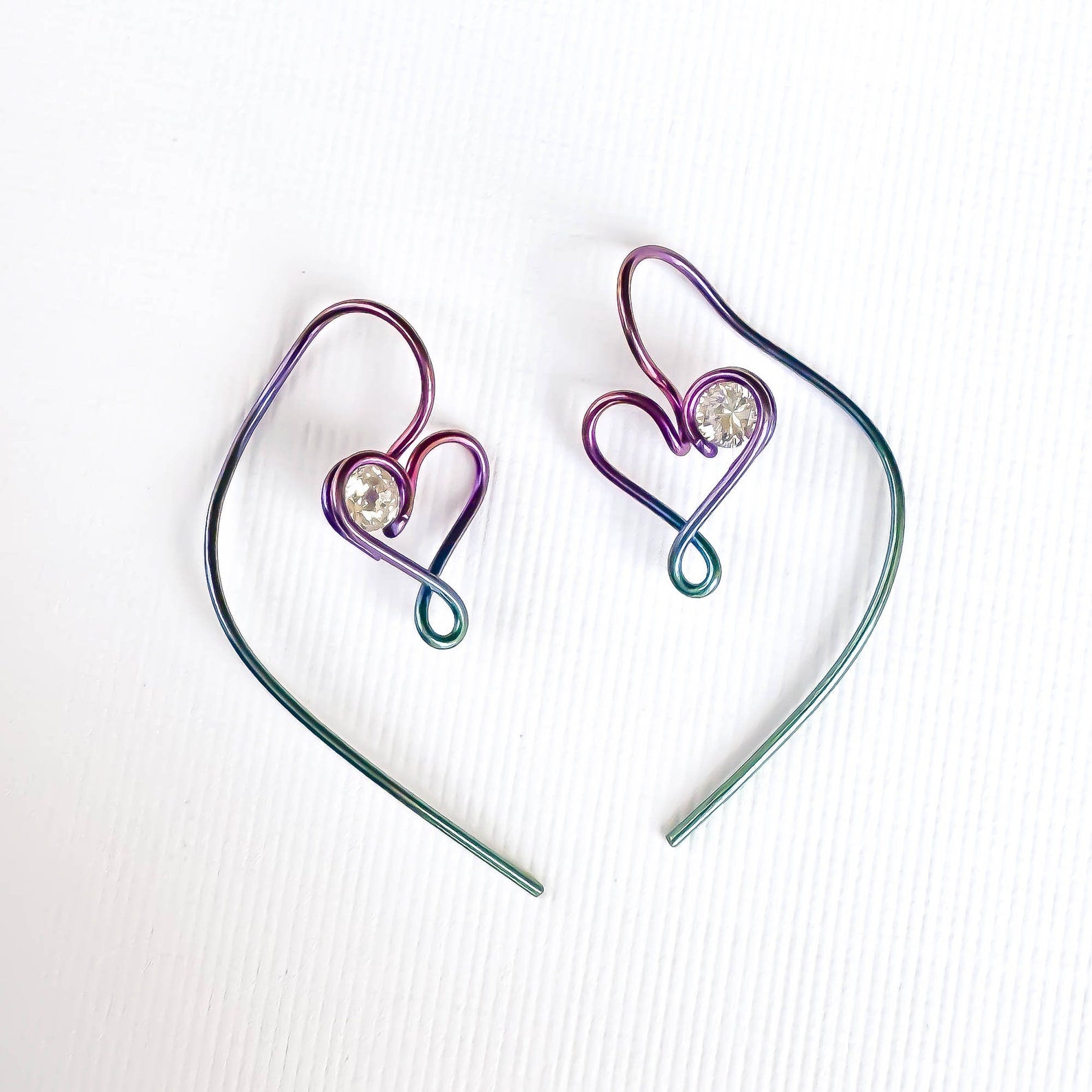 • Hand wound heart threader earrings, created out of 20 gauge niobium round wire. Floating cubic zirconia (CZ/simulated diamond).