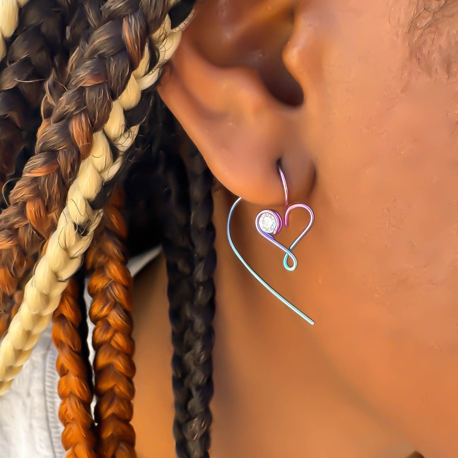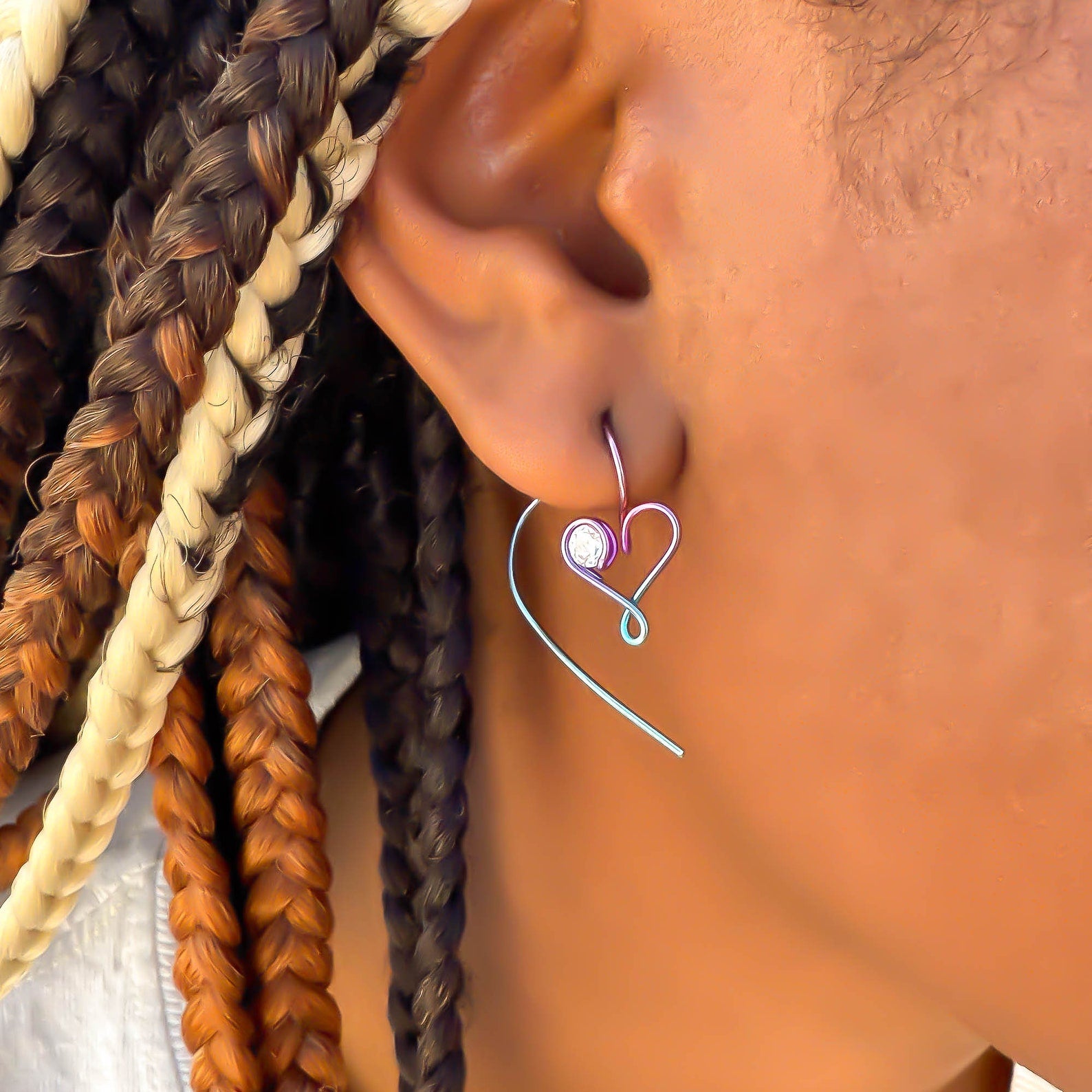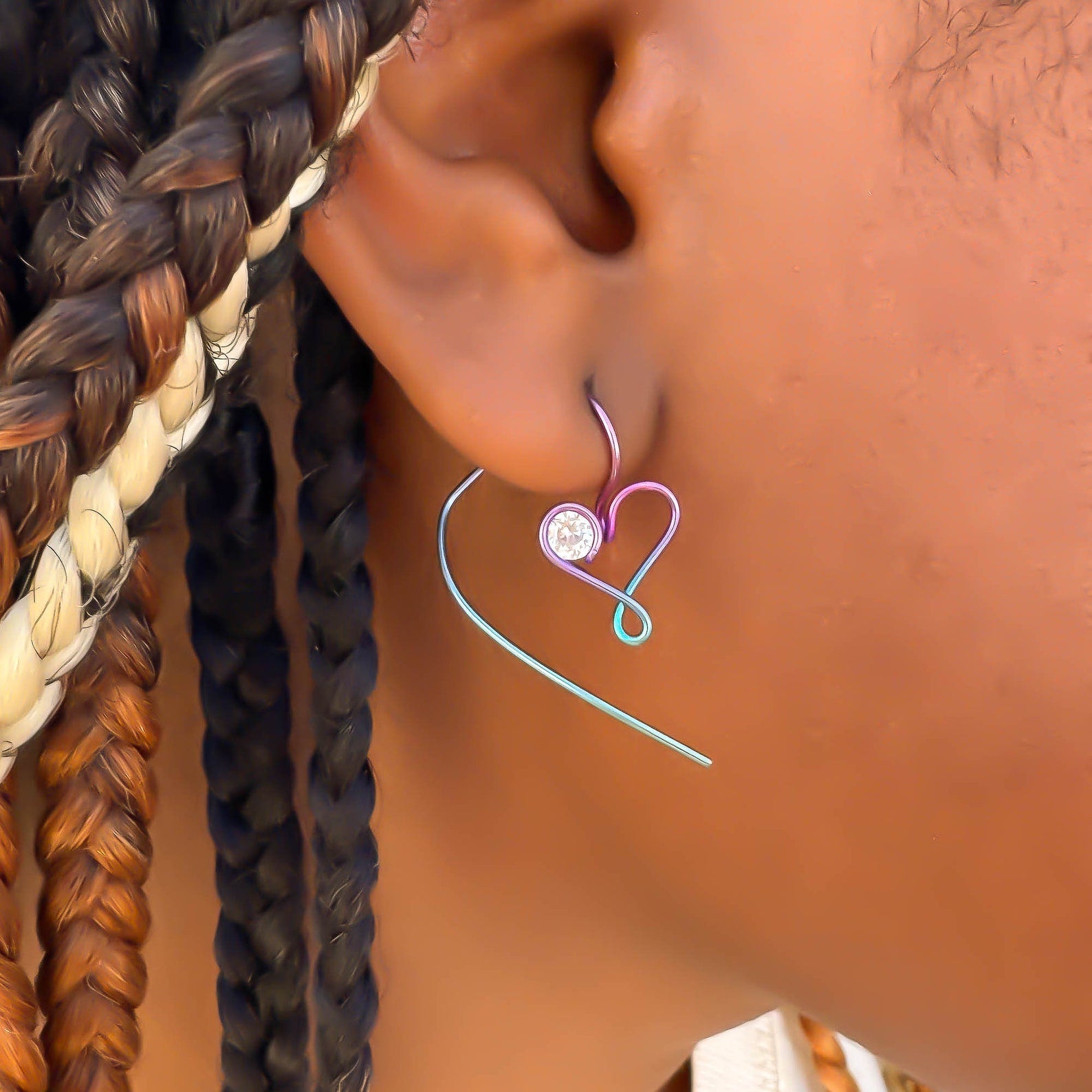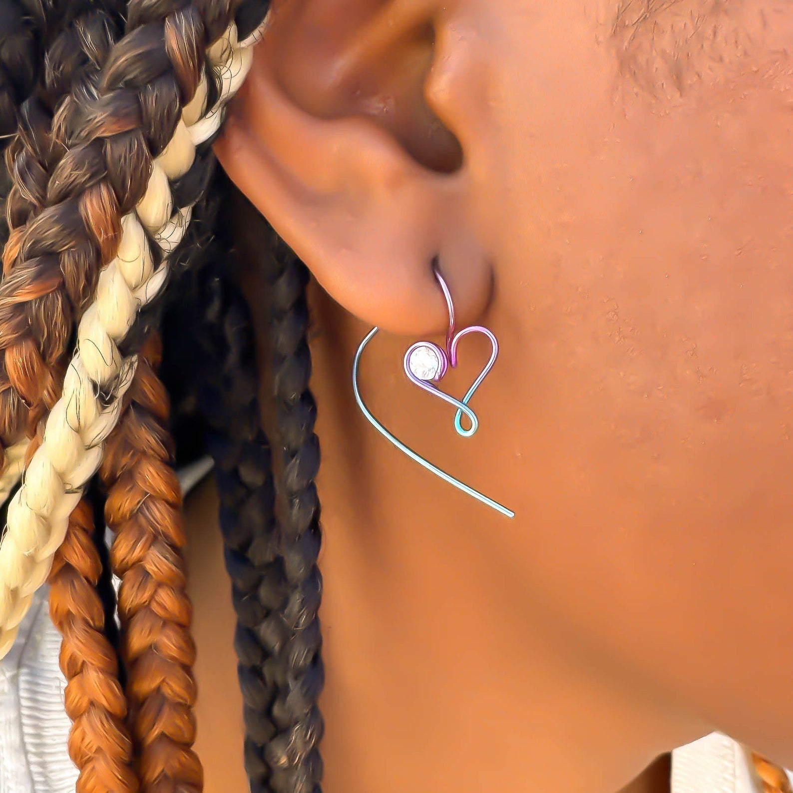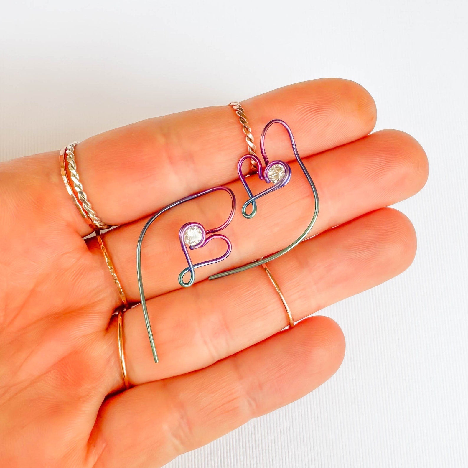• Hand wound heart threader earrings, created out of 20 gauge niobium round wire. Floating cubic zirconia (CZ/simulated diamond).
