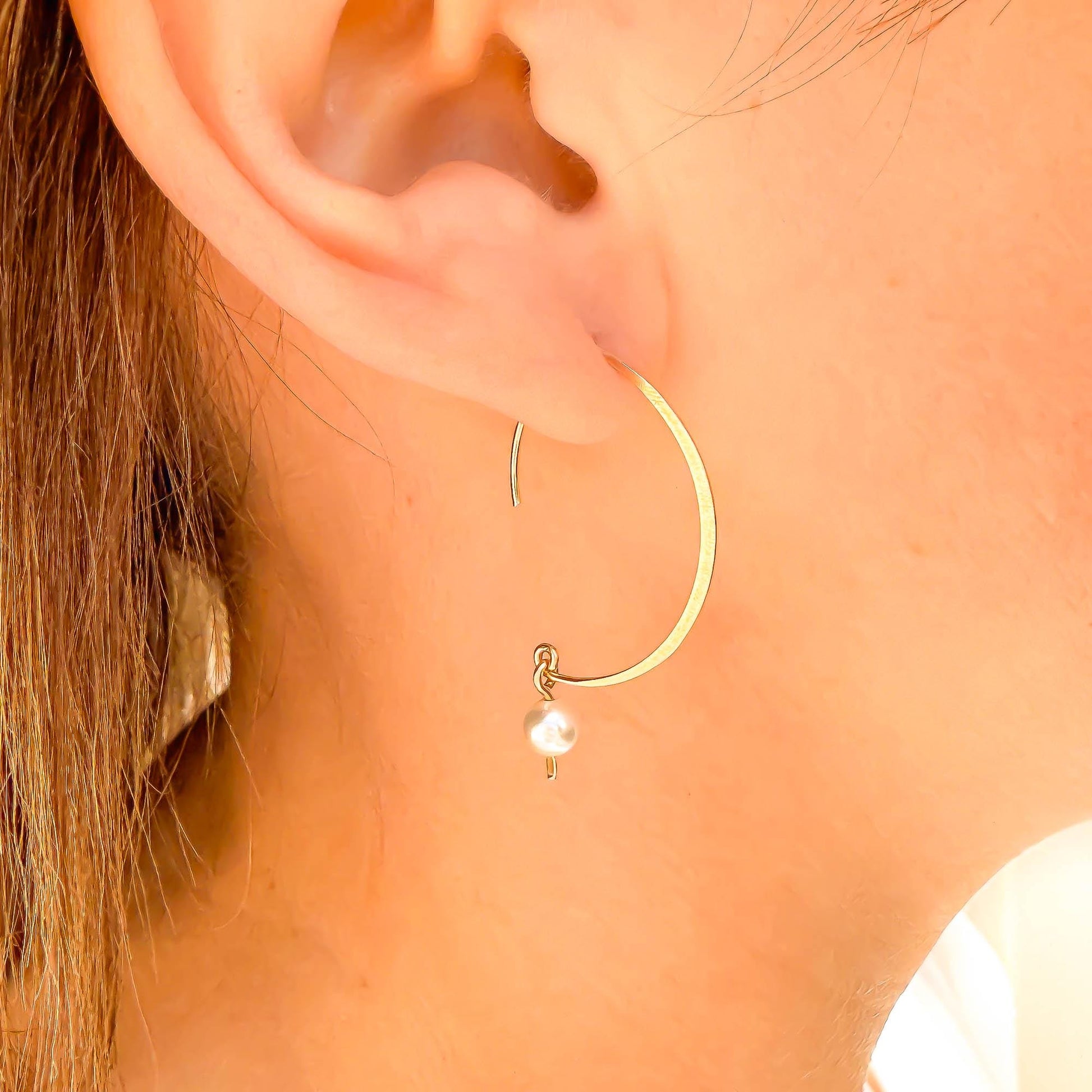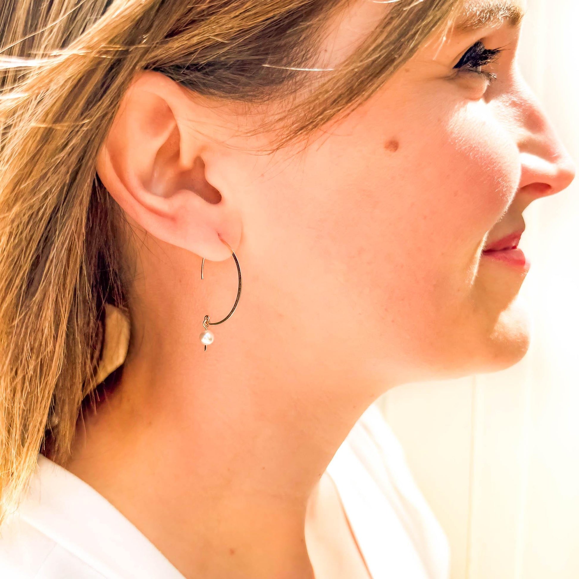 Slide the shorter, round end through the front of your piercing, until the earring is sitting at the "curve" upright in your ear. These earrings traditionally don't require earring backs. But for those with active lifestyles, and if you like a secure fit—we do offer 5mm silicone earring backs upon request. Slide/twist on gently, to preserve the earring's shape.