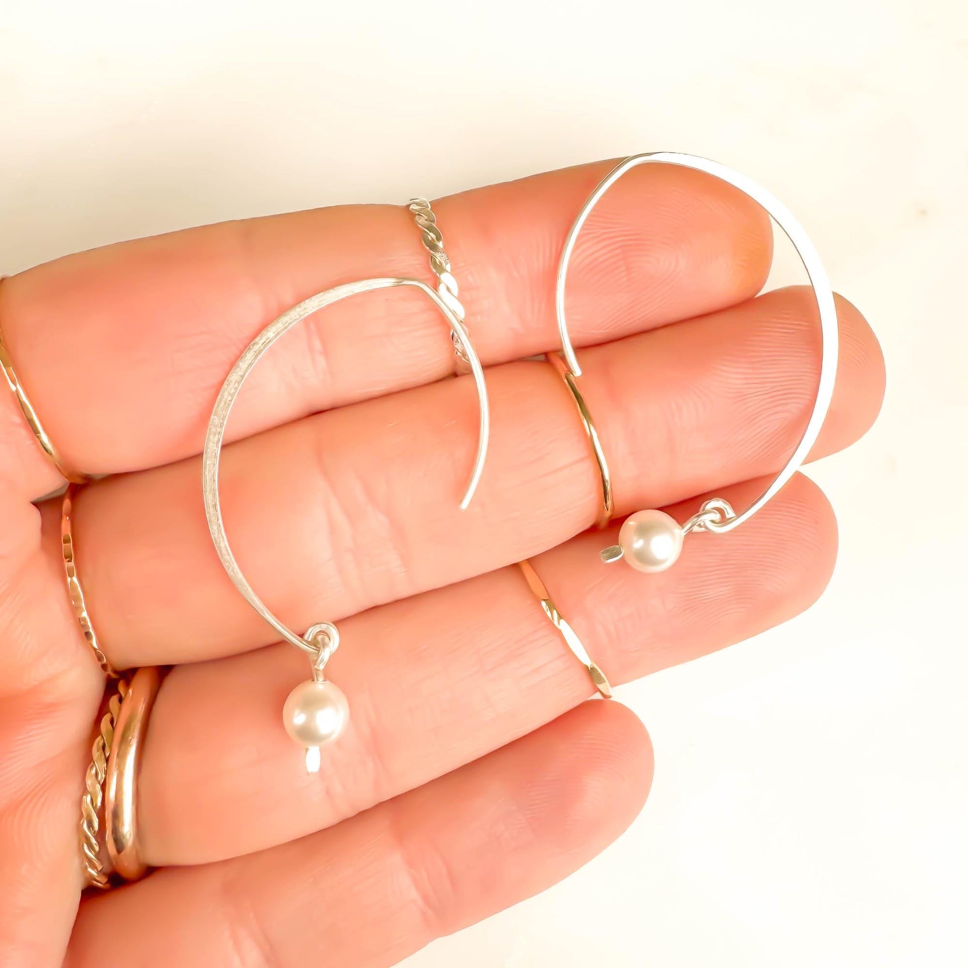 • Handcrafted out of 20 gauge wire in sterling silver, with a 5mm crystal pearl. Simulated pearls are perfect in color, depth, and shape.