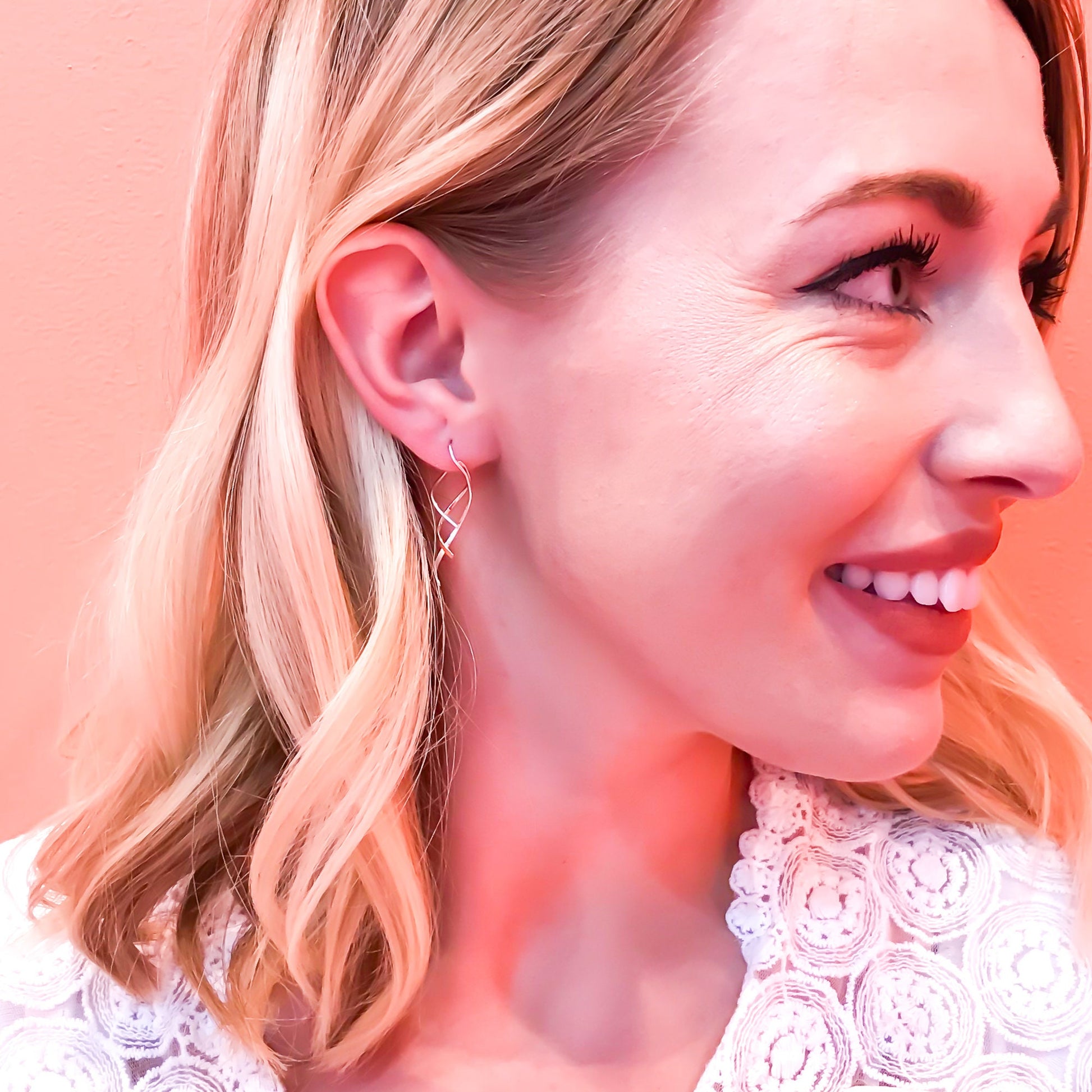 These earrings are sometimes called, “corkscrew” earrings, because you twist them, to insert them. The shorter and round end slips through the front of your piercing, and you pull downwards while gently rotating the earring, until it sits upright in your ear. This fun symmetrical design, is an original creation and truly a one of a kind.