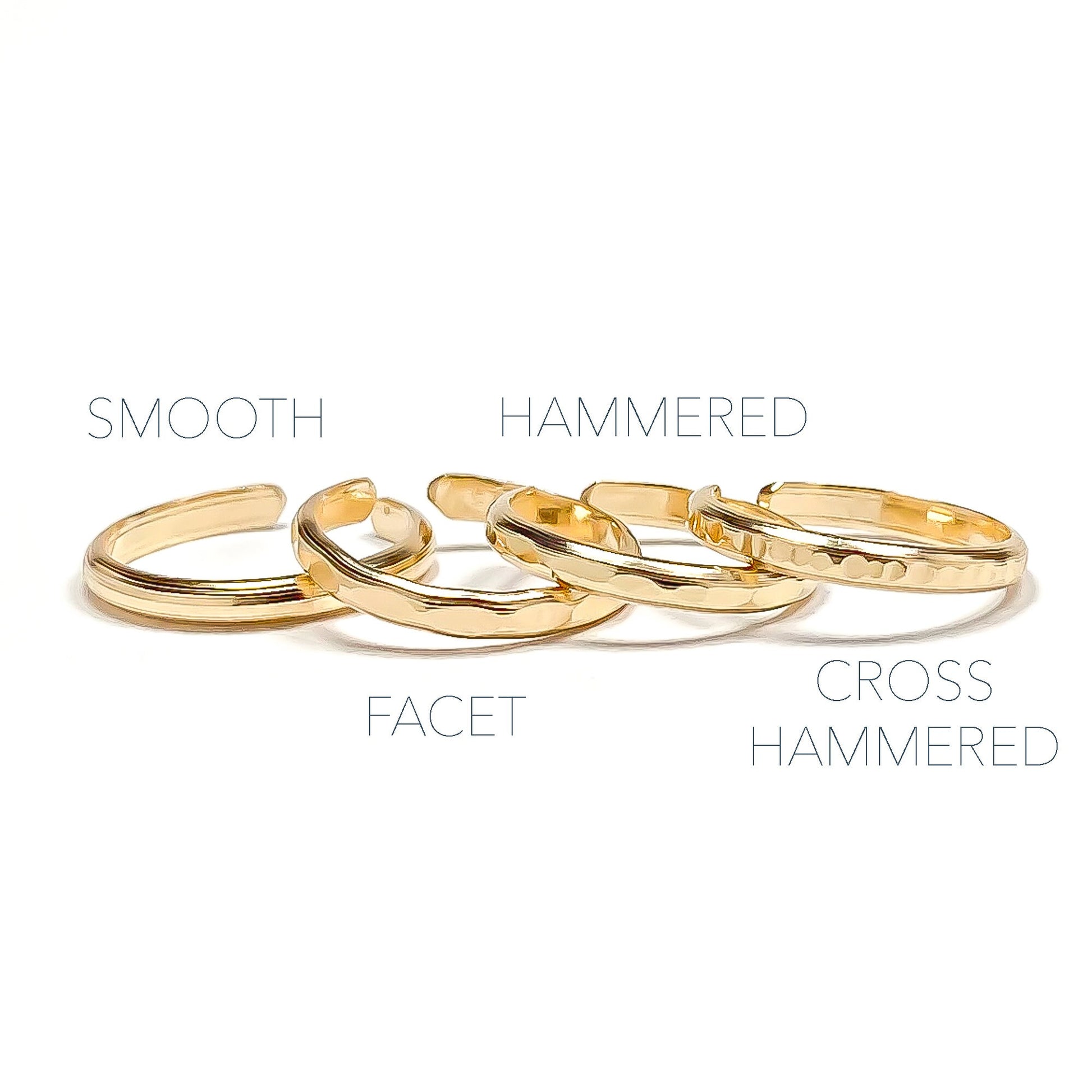 • Pictured: Three separate 14K gold filled mini ear cuffs, with hand hammered textures (cross hammered, facet, hammered). Also available—smooth finish.