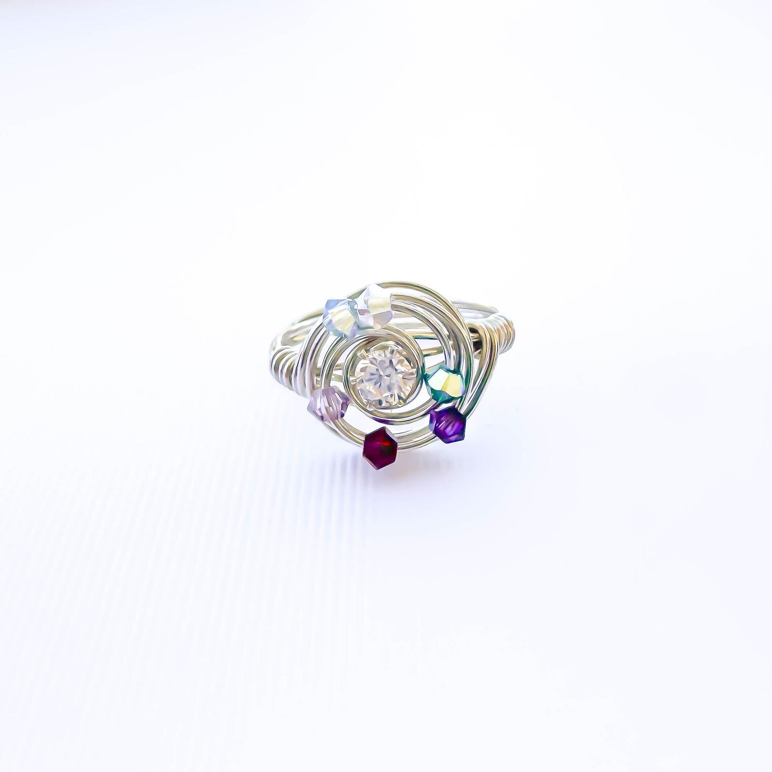• This beautiful ring is handcrafted out of one continuous strand of 22 gauge sterling silver wire, that has been wrapped and hand woven to create a whimsical birthstone or mother's ring. The central stone is a simulated diamond or CZ (cubic zirconia). We use Swarovski crystal beads that include (1) purple, (1) red/ruby, (1) pink, (1) green, (1) translucent (with a rainbow undertone), and (1) blue colors.