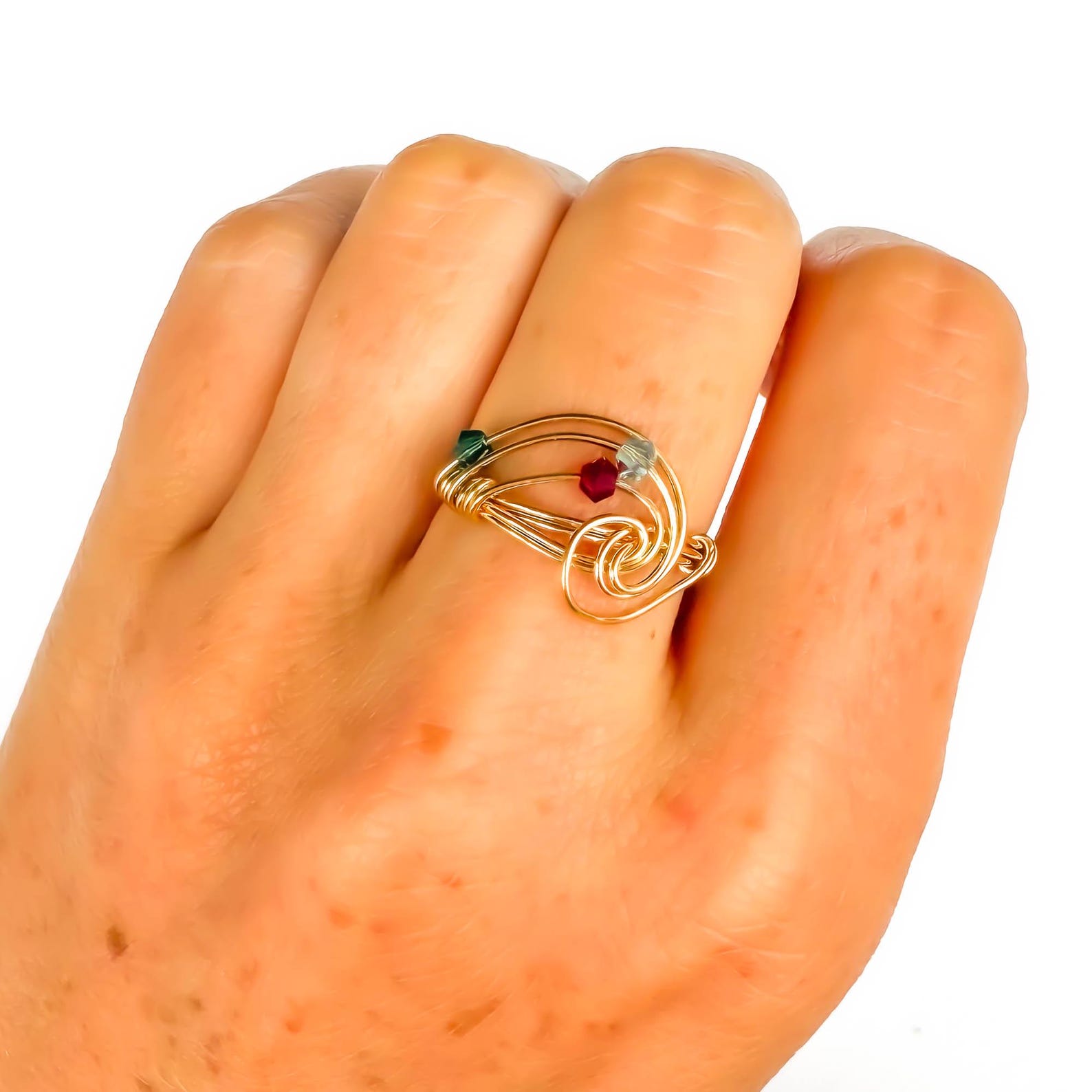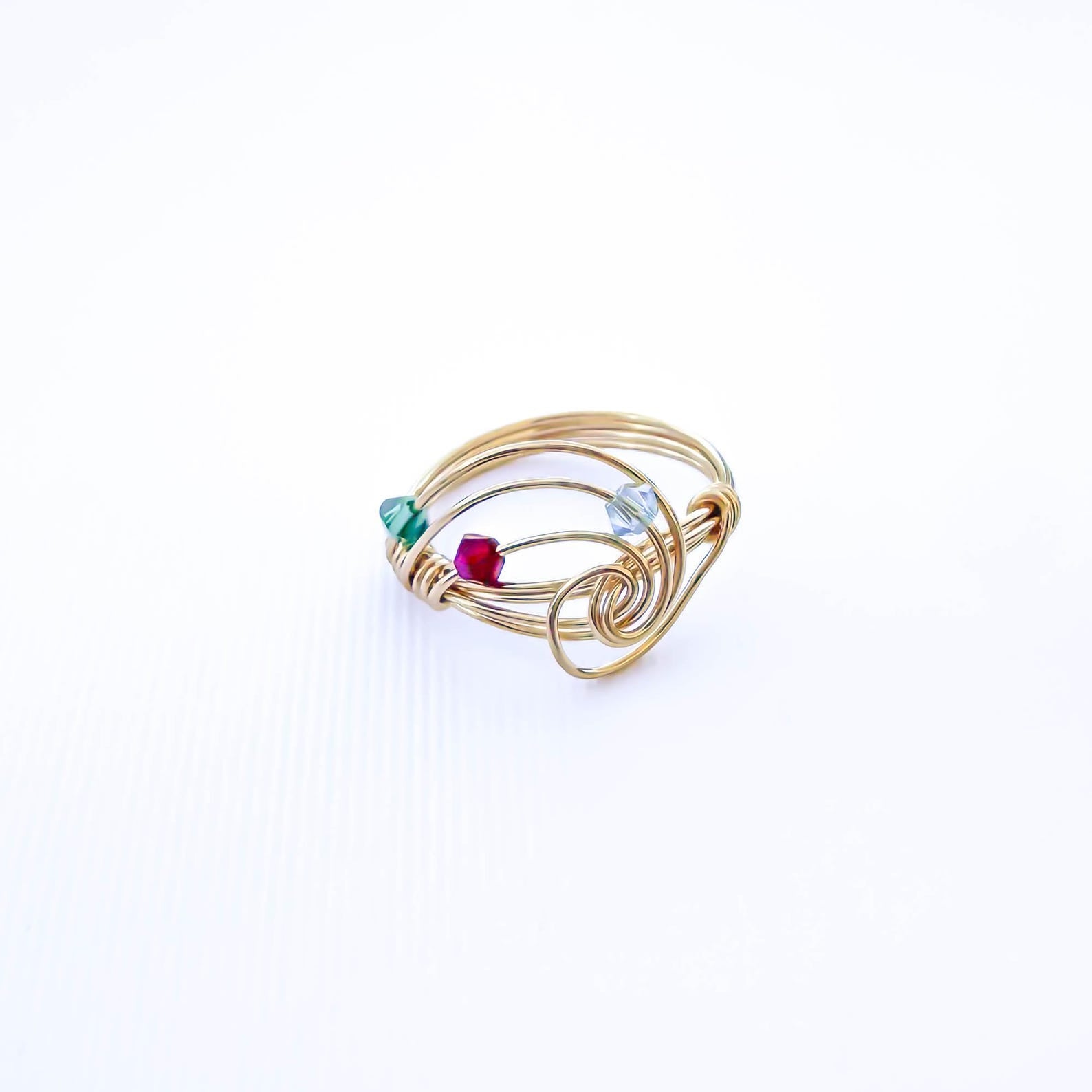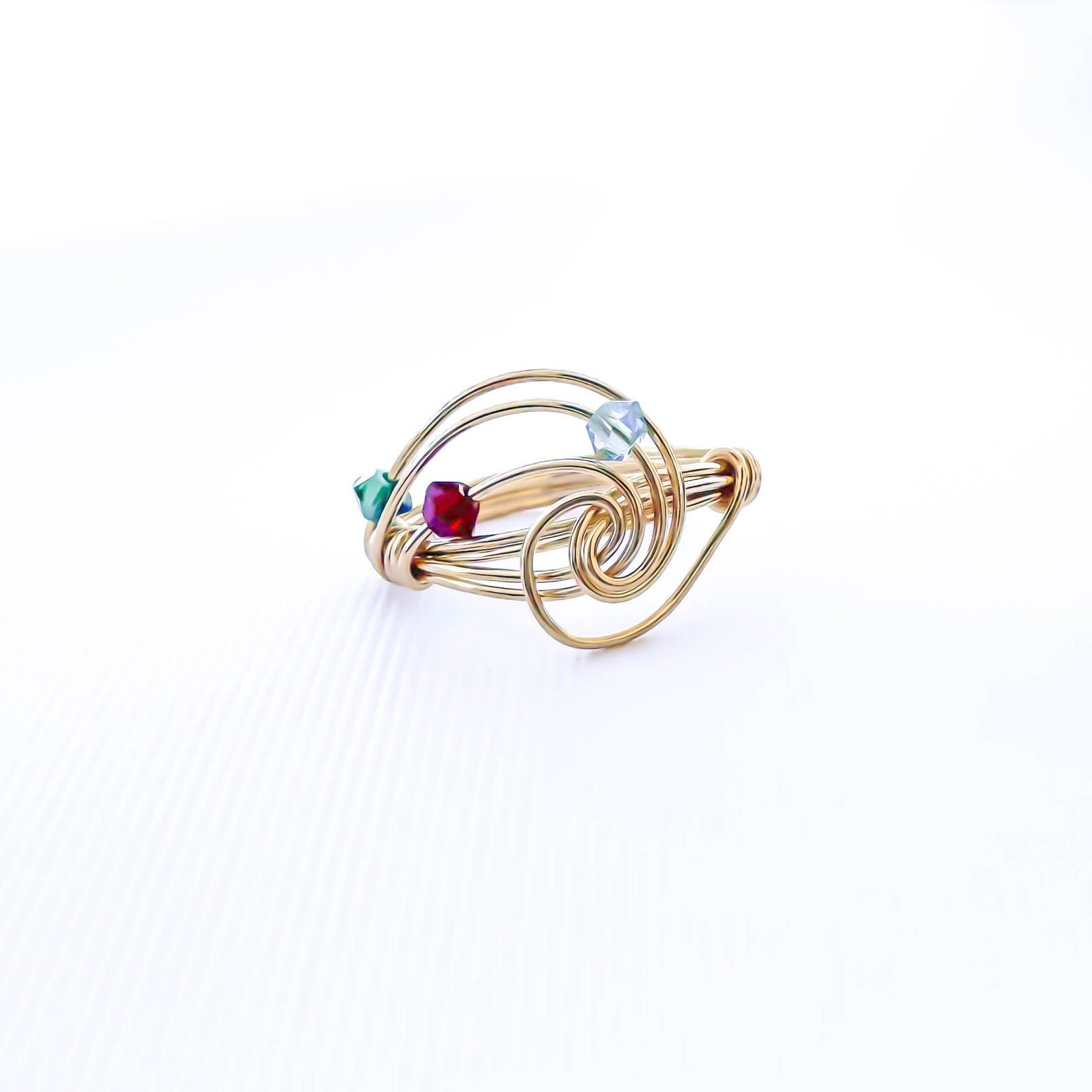 • This beautiful ring is handcrafted out of one continuous strand of 22 gauge 14K gold filled wire, that has been wrapped and hand woven to create a whimsical birthstone or mother's ring. We use Swarovski crystal beads that include (1) light blue, (1) green, and (1) red/ruby colors.
