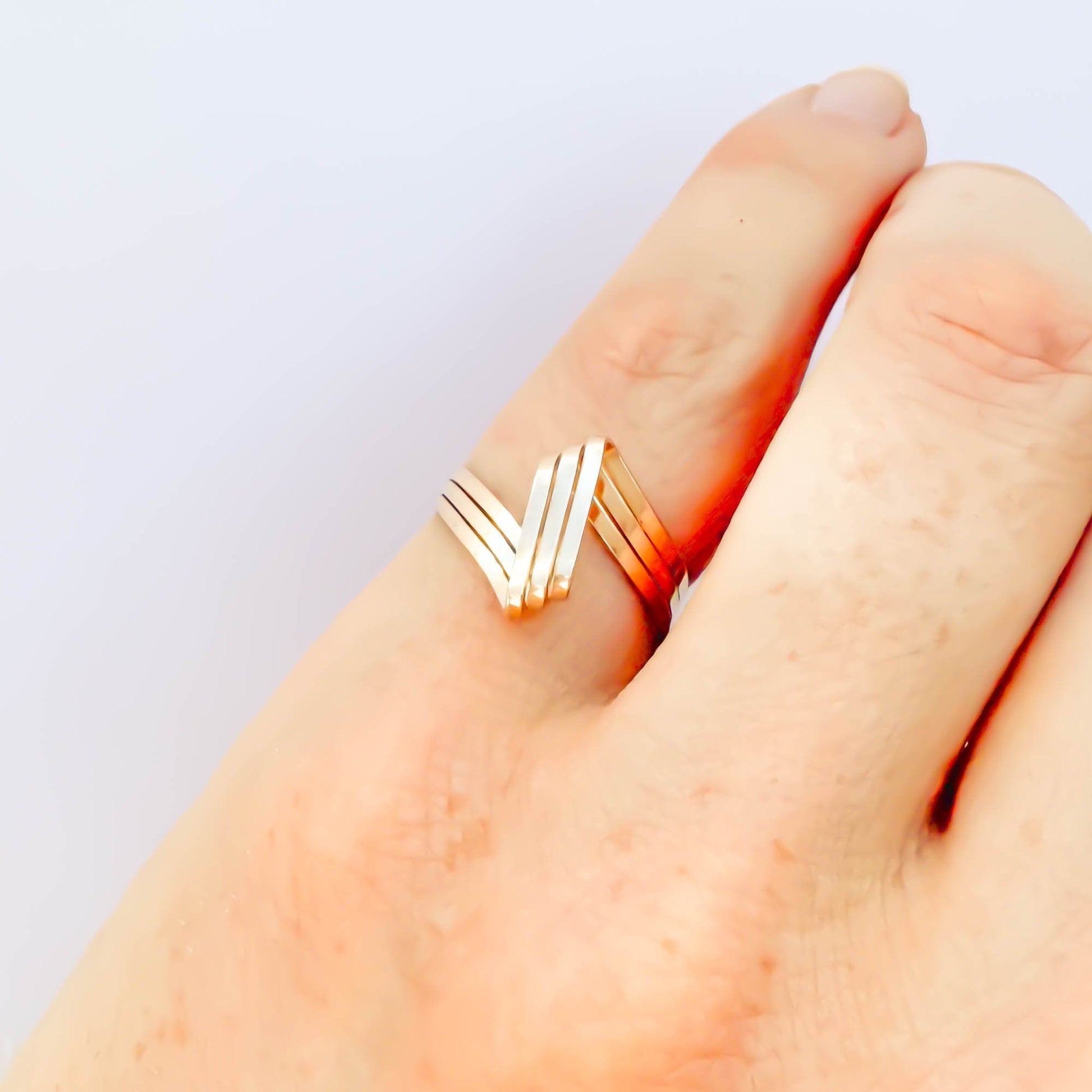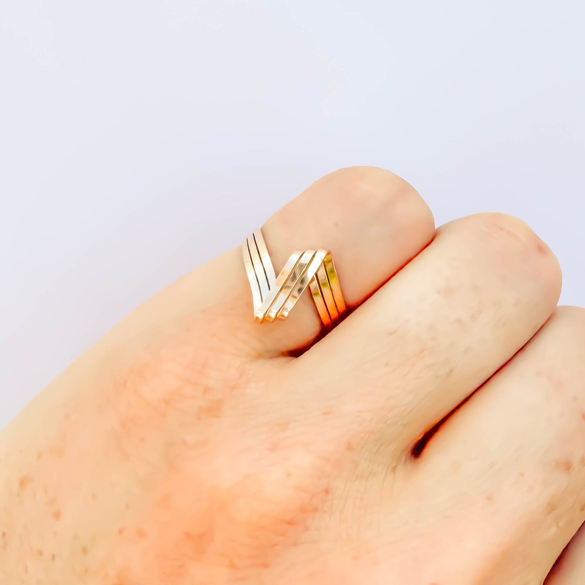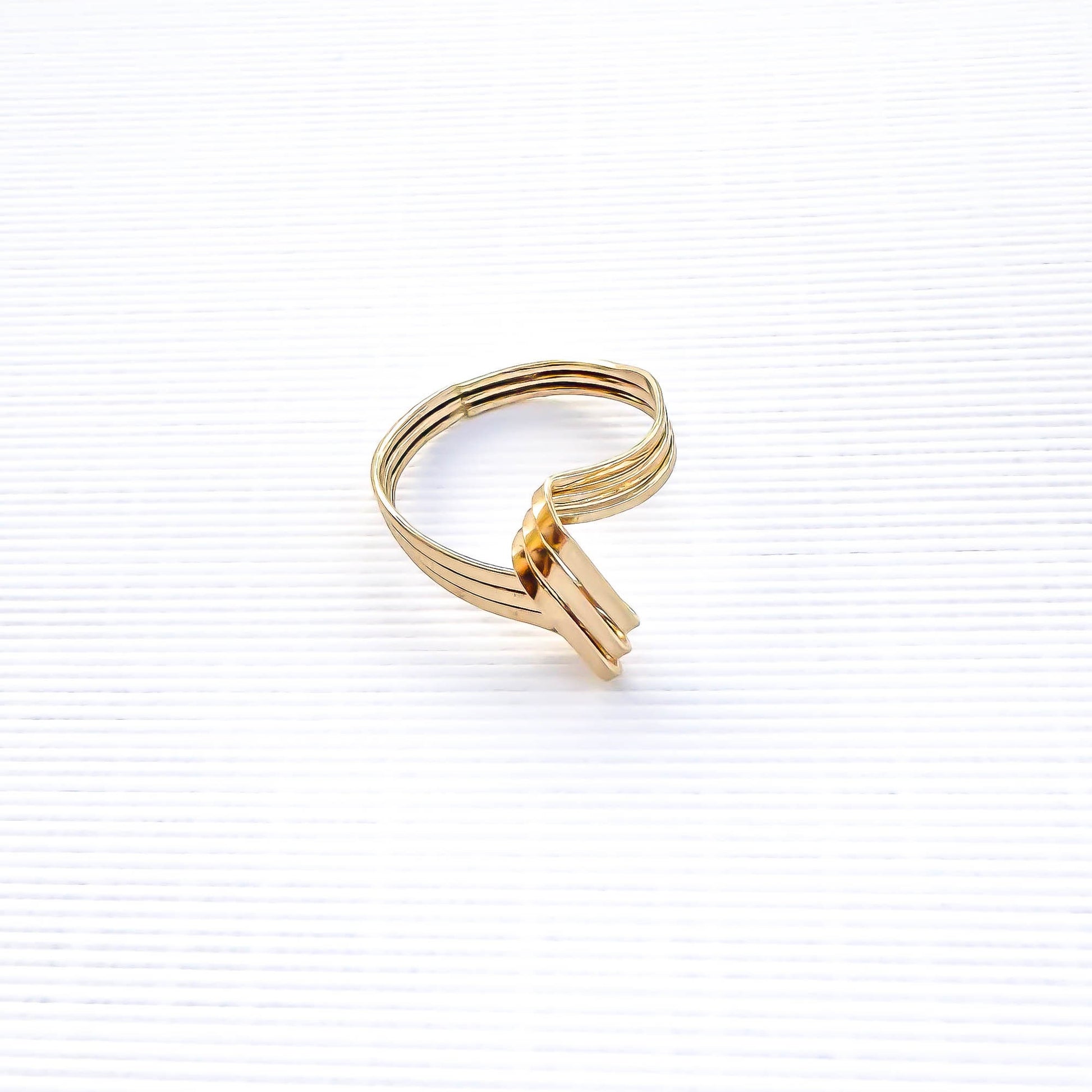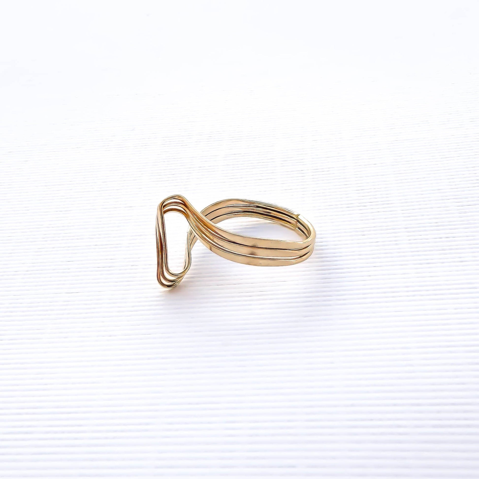 • Hand woven open loop ring, sized as a pinky ring or midi/knuckle ring. Made out of 14K gold filled. Three twisted and flattened 18 gauge wire, for a reflective finish.