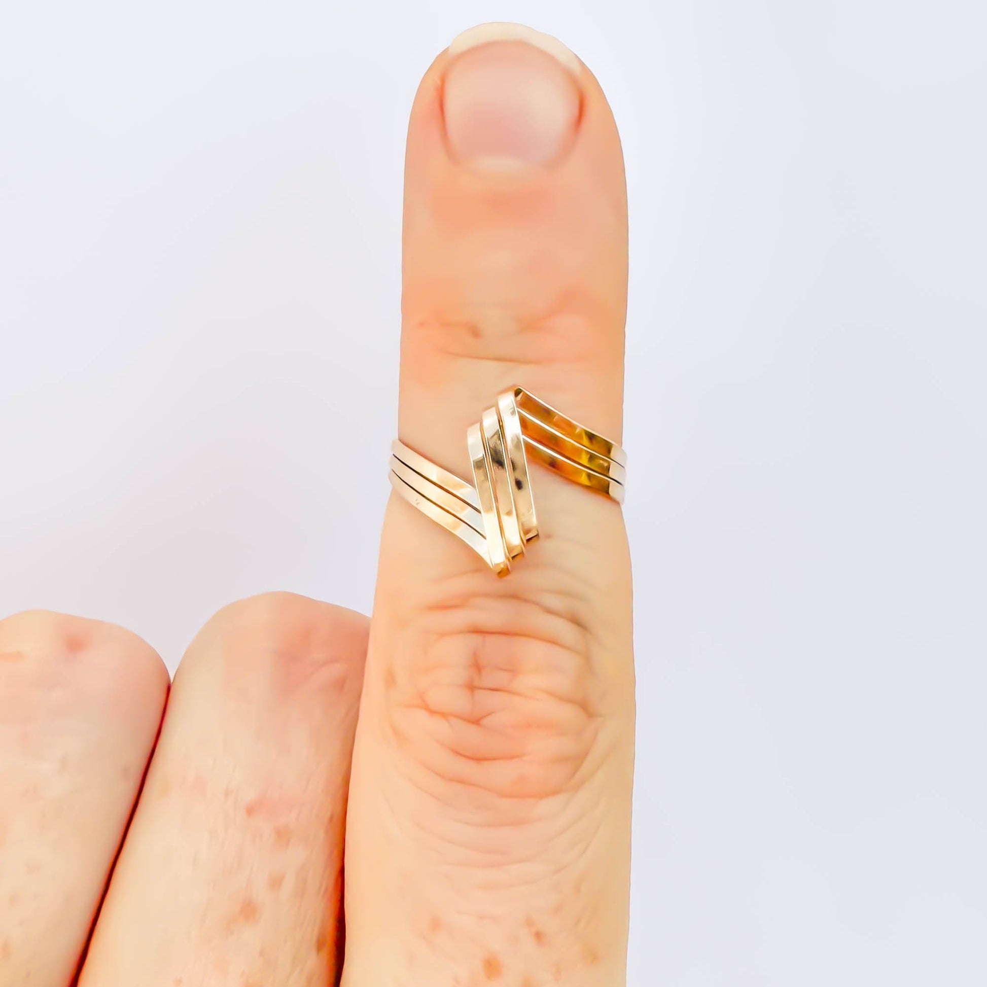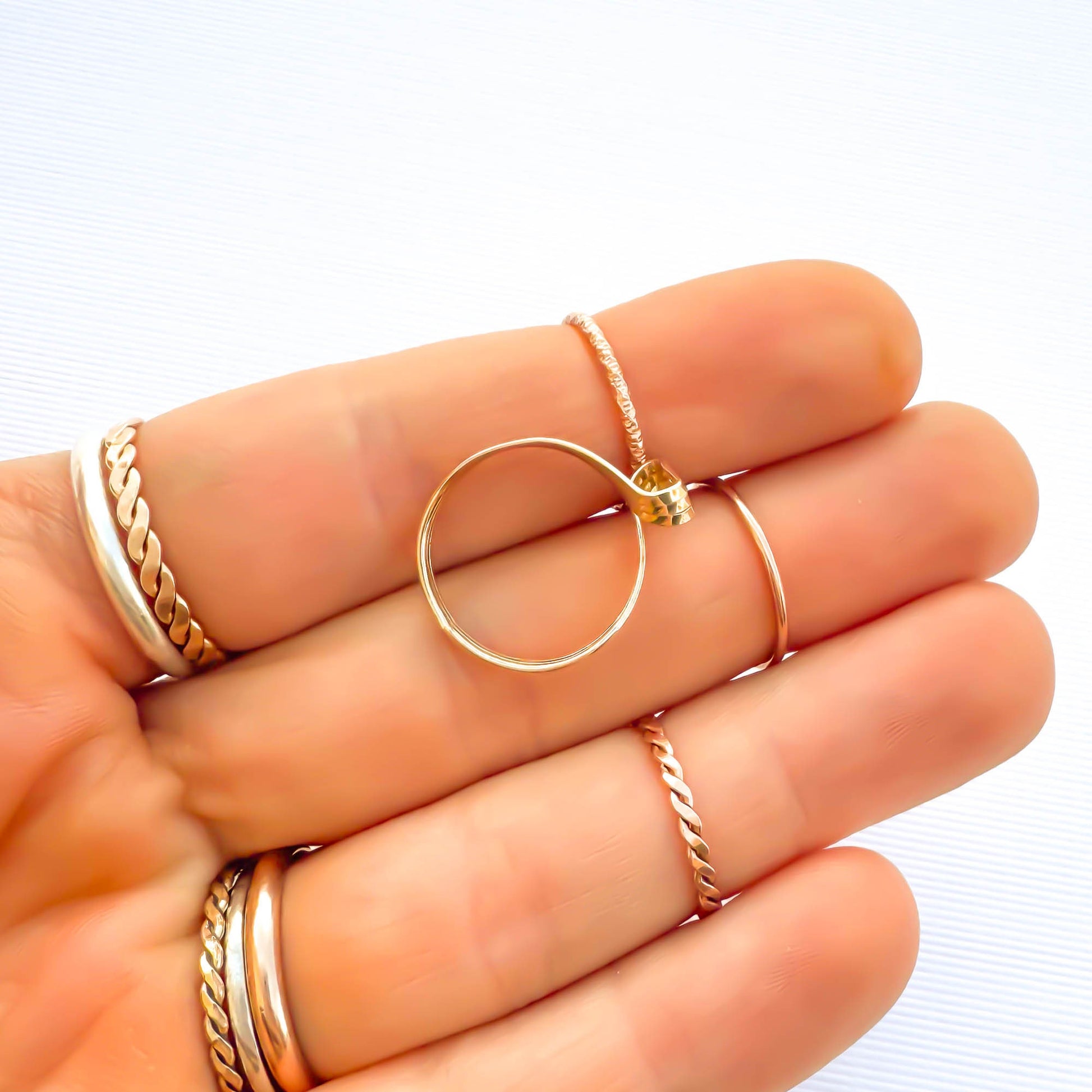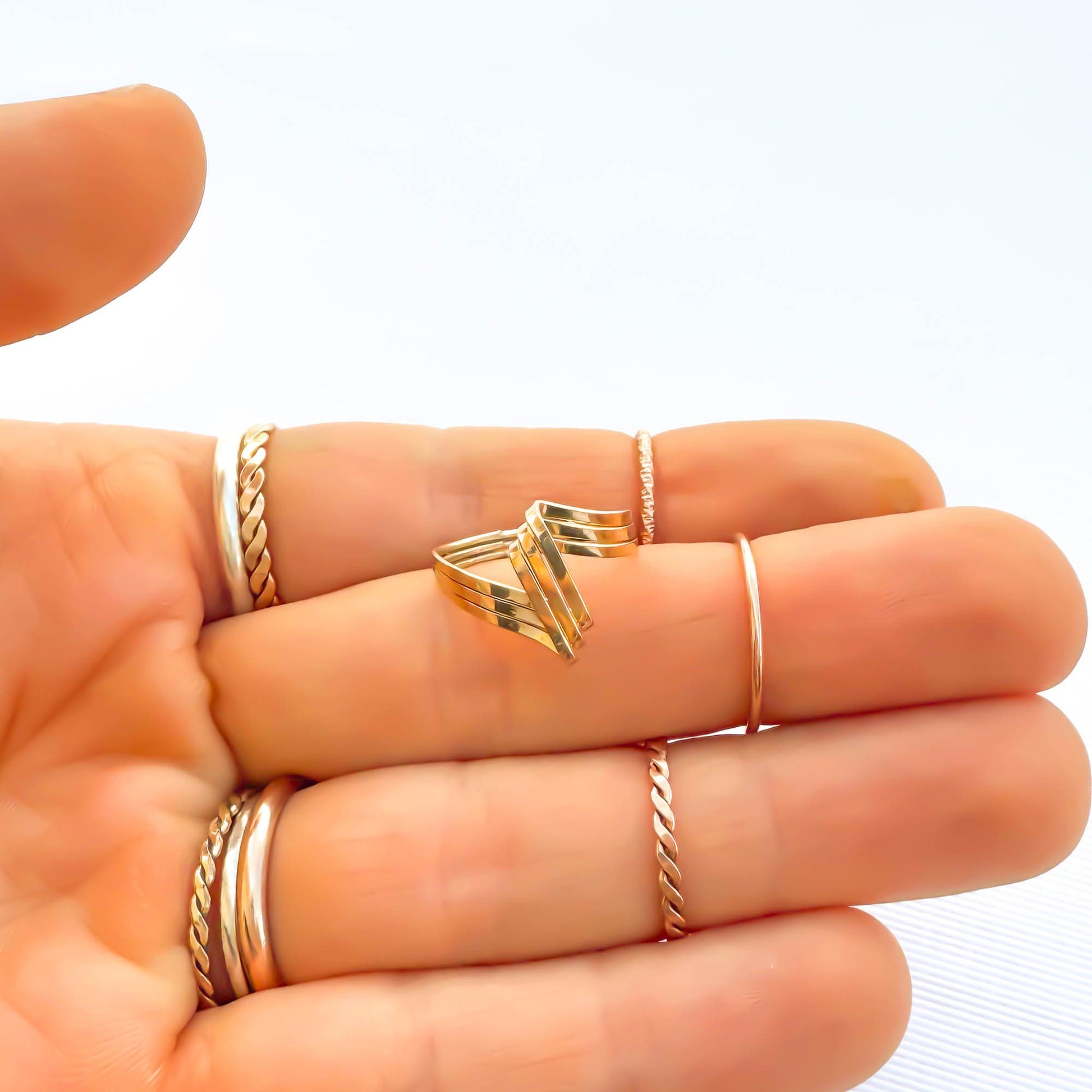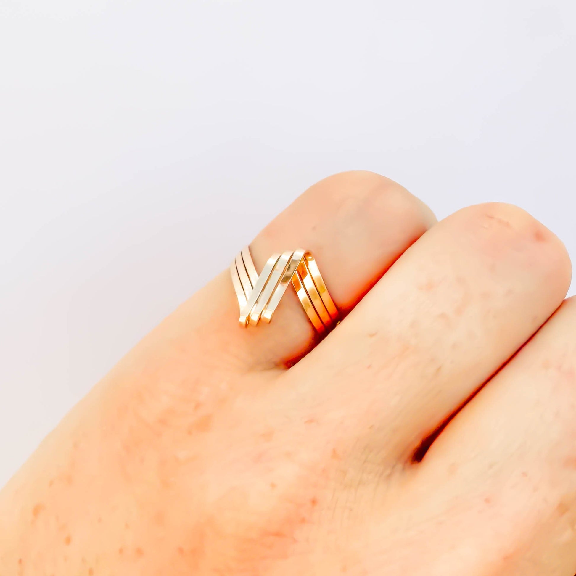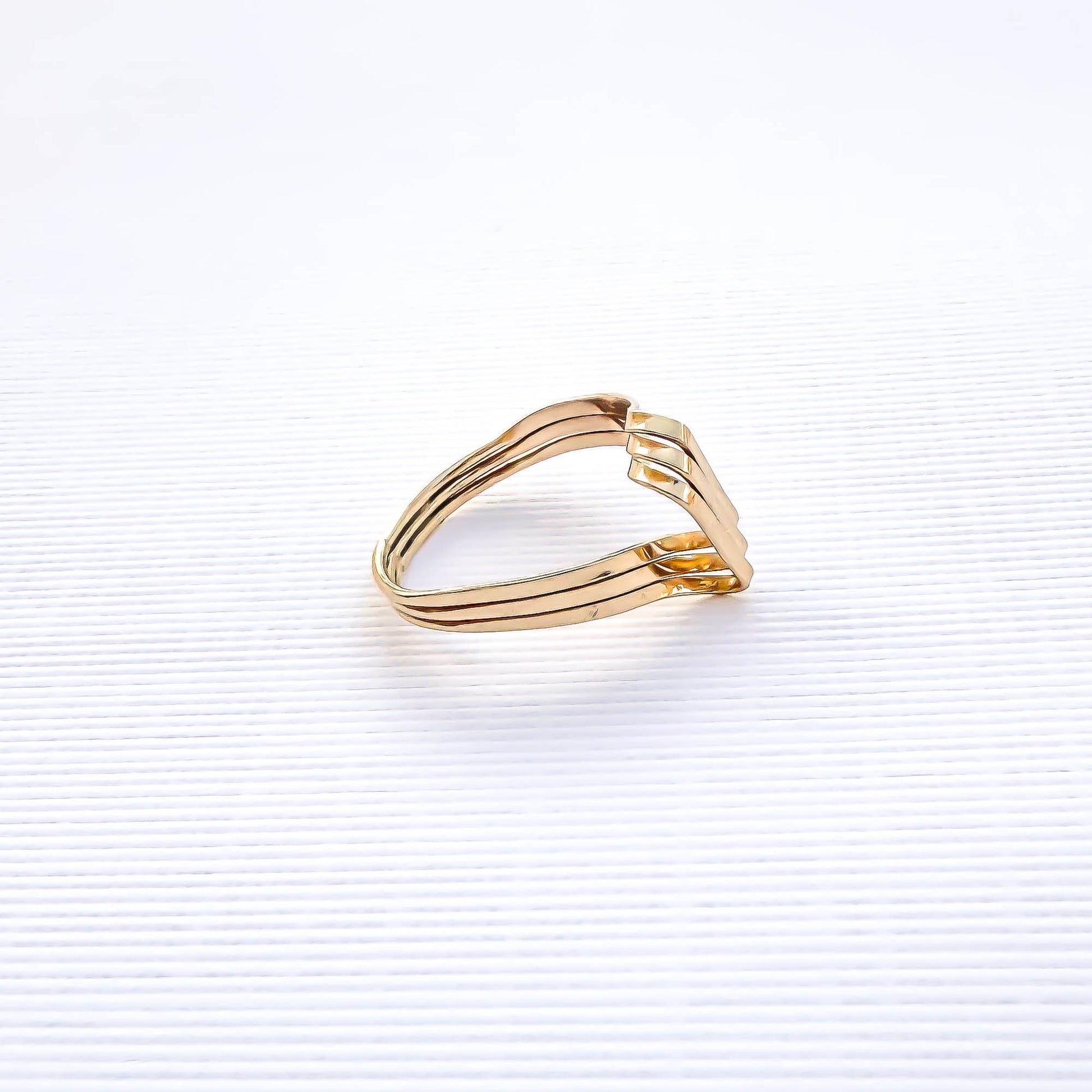 • Hand woven open loop ring, sized as a pinky ring or midi/knuckle ring. Made out of 14K gold filled. Three twisted and flattened 18 gauge wire, for a reflective finish.