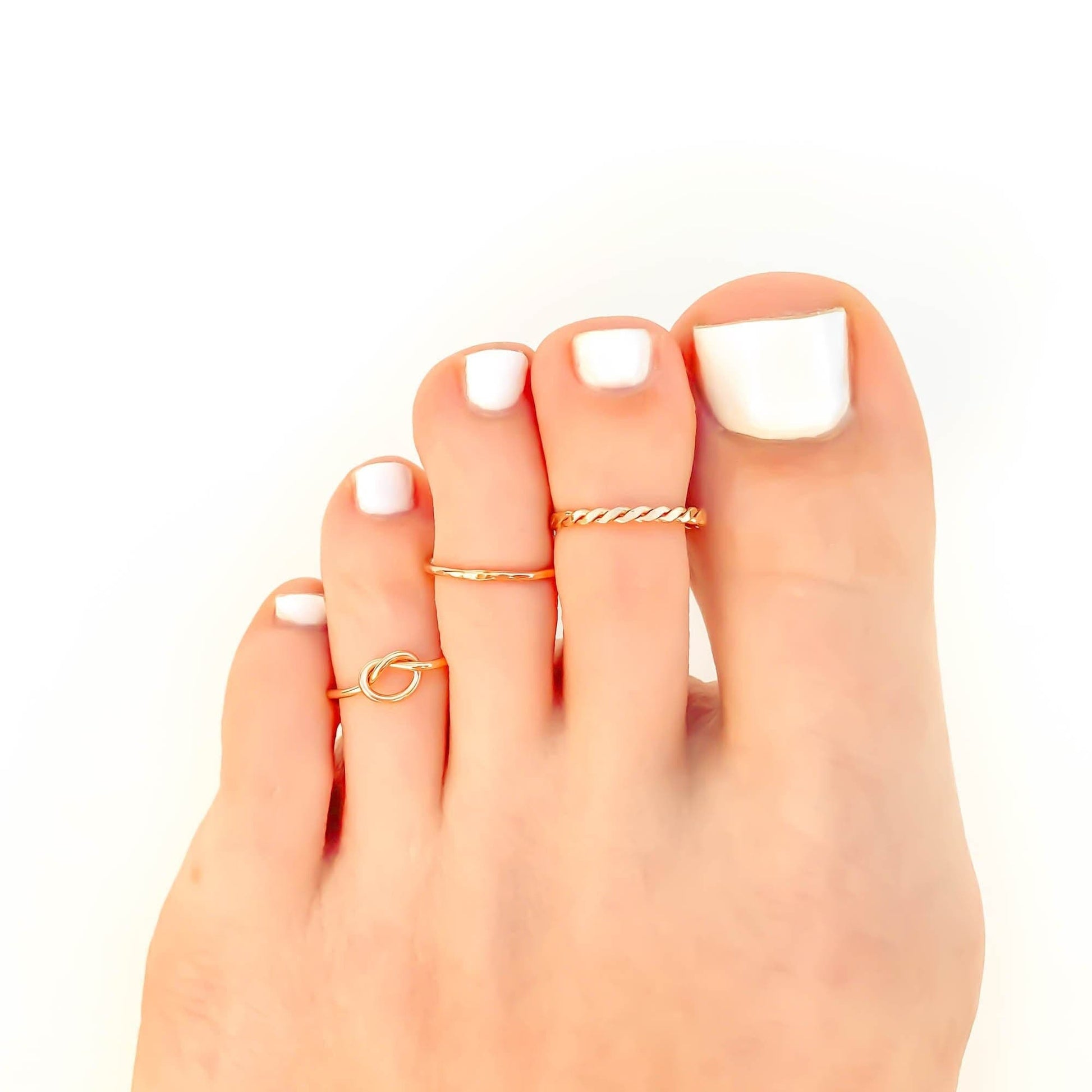 Minimalist, dainty yet durable, sized toe rings. Toe rings shown are the styles of twist, cross hammered, and knot. Also available in hand hammered textures of facet, and hammered. Or no texture—smooth/round. Feel free to stack toe rings, wear one for each toe, or wear as a standalone!
