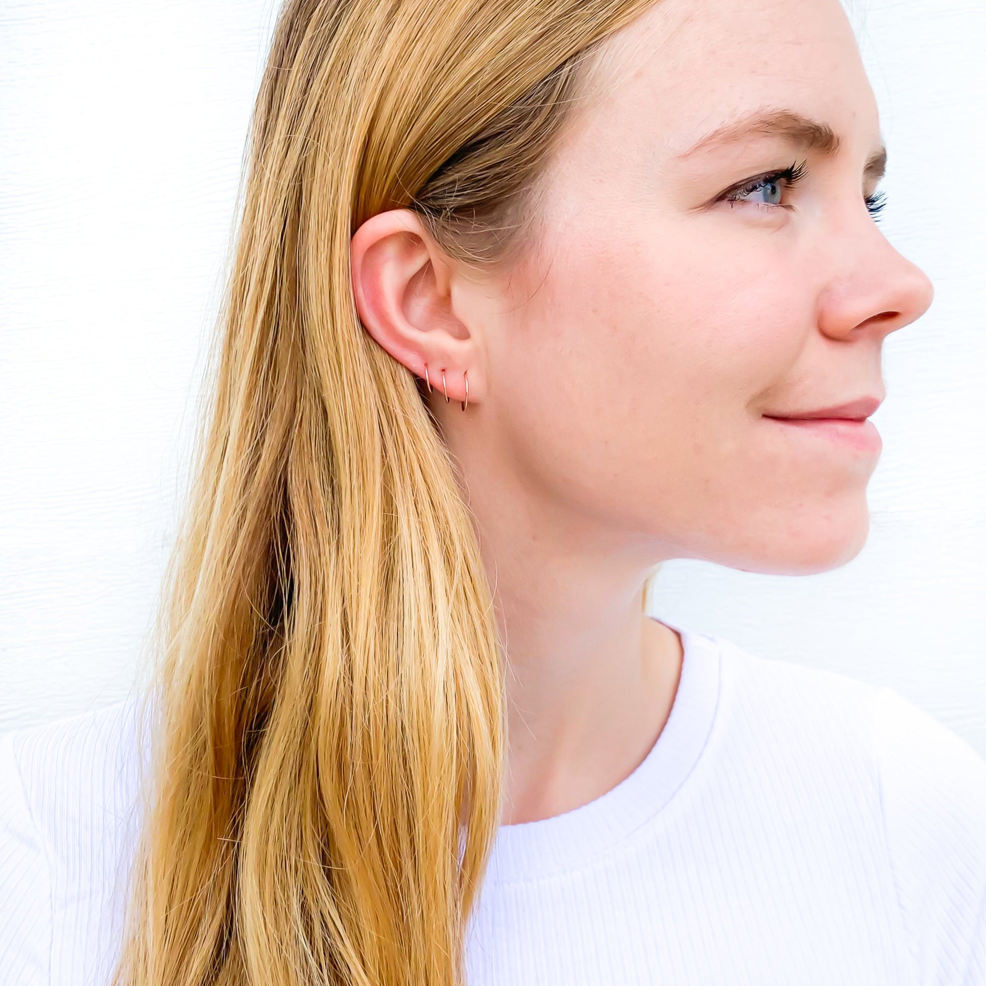 The model is wearing 12mm, 11mm, and 9mm hoop earrings.