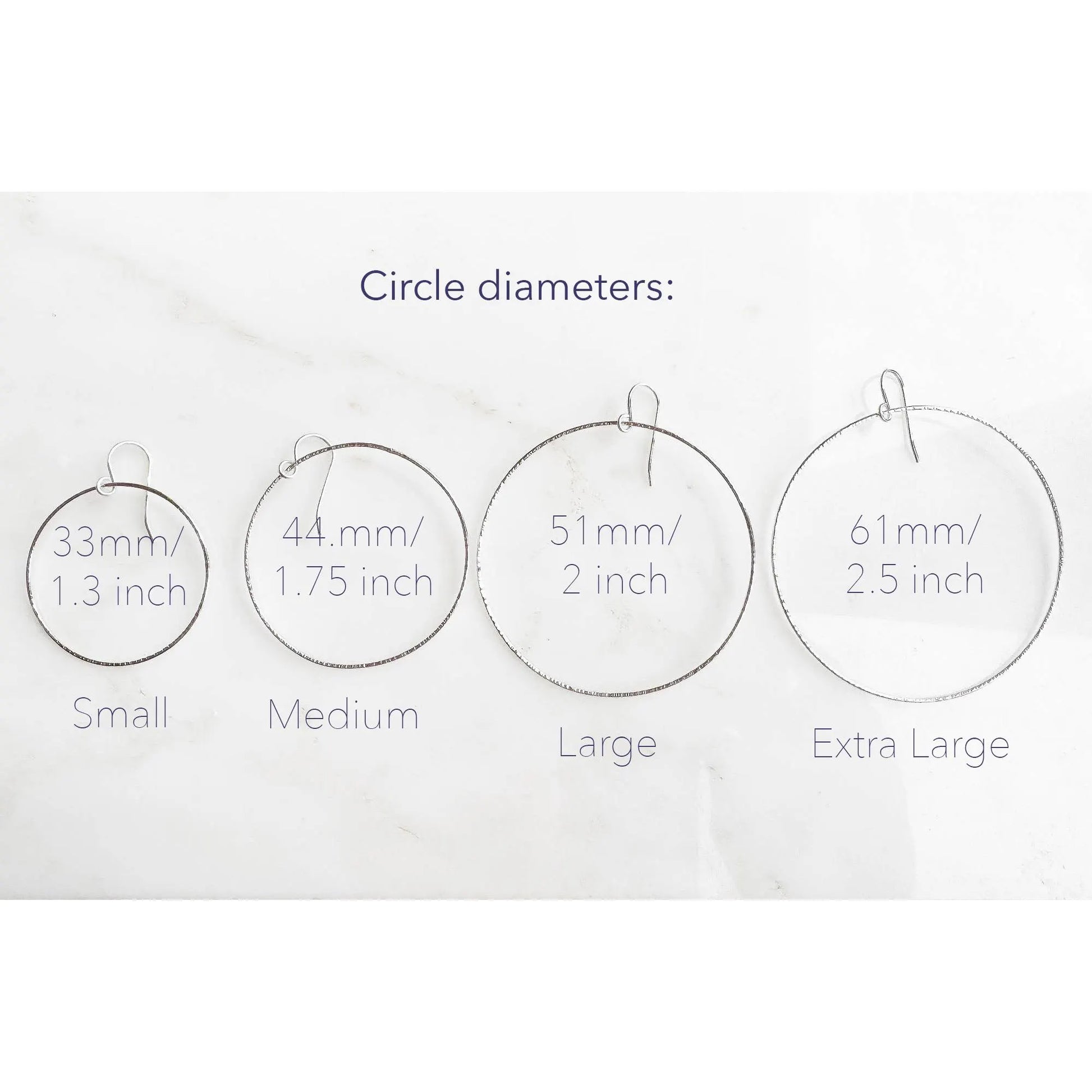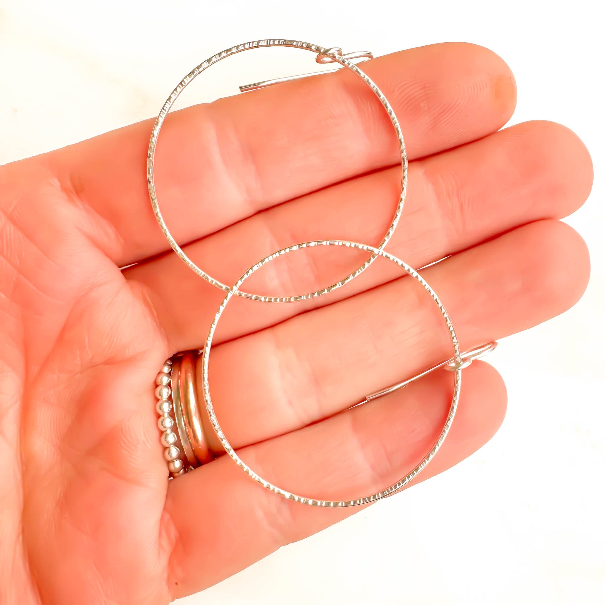 The model is wearing 1.75 inch or 44mm diameter hoop earrings; size medium. Hand hammered texture.