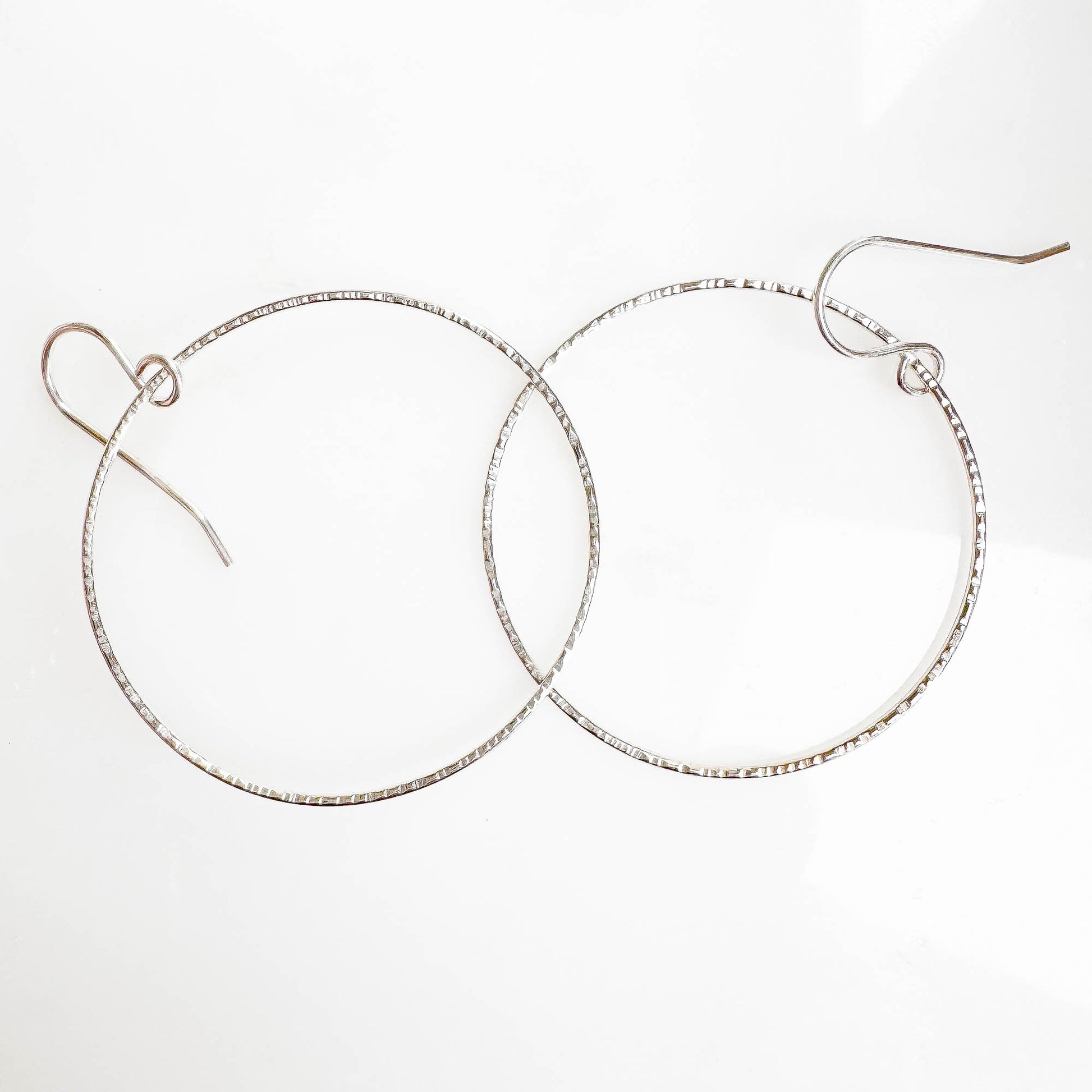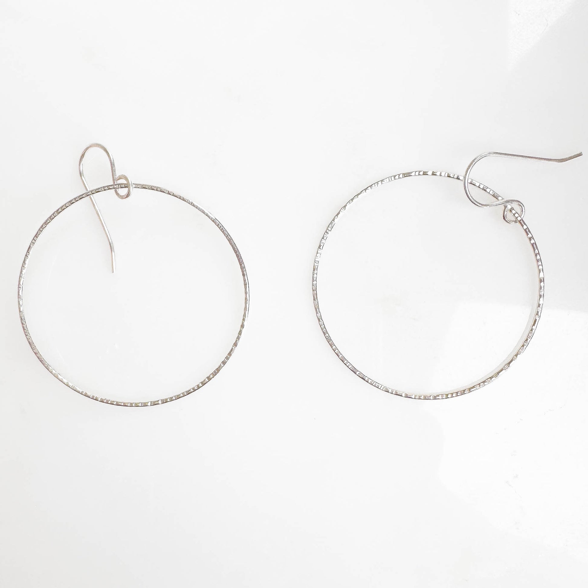 These earrings are free moving, and rotate around the French wire that slips through your ear. Cross hammered texture is on ONE side. These hoops or circlets are forward facing, rather than parallel to your face—for a more bold look.