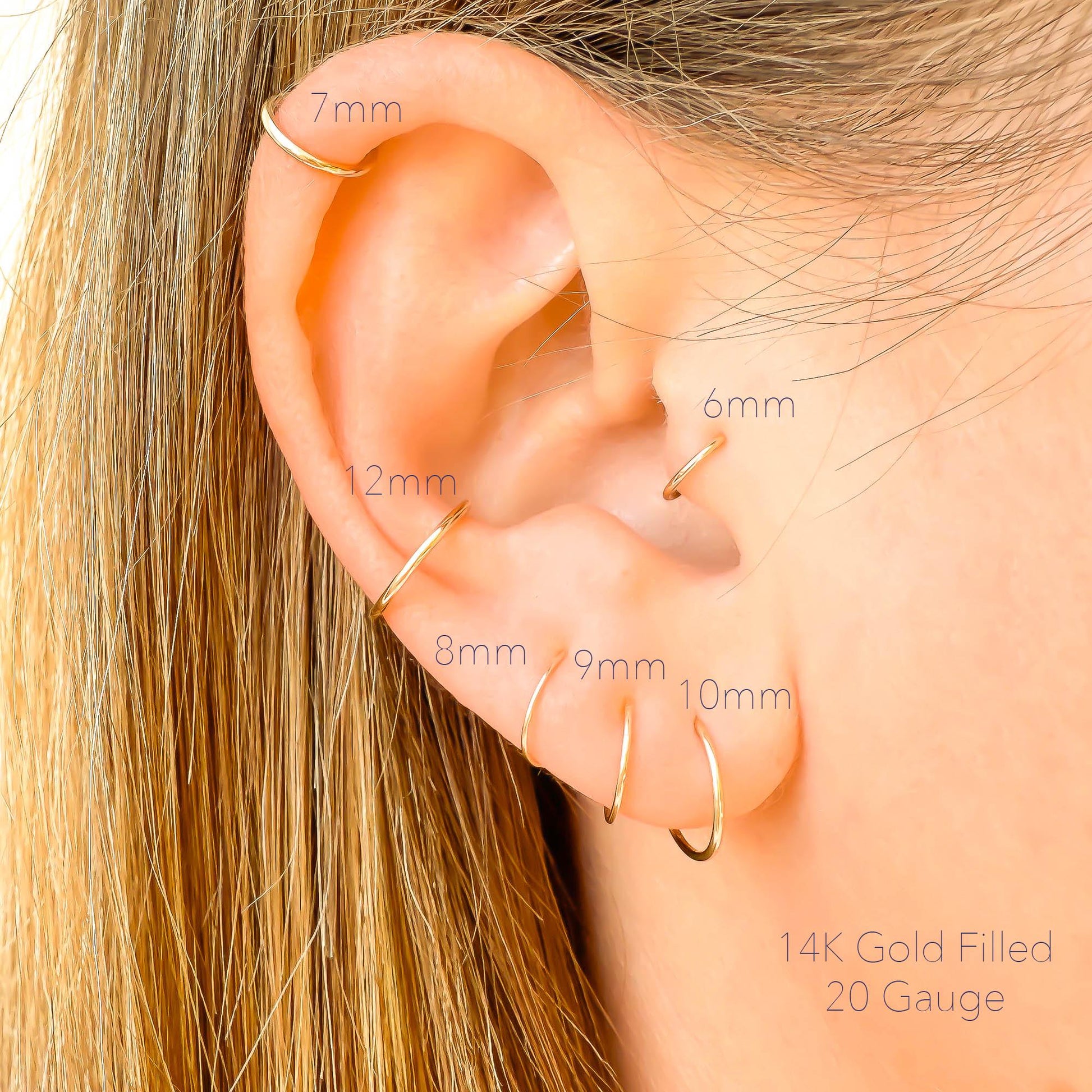 • The model is wearing a 7mm 20 gauge, 14K gold filled continuous hoop earring in the first (upper cartilage) piercing, 12mm in the (cartilage conch) second middle piercing, and 12mm in the earlobe/3rd piercing. Perfect size for your cartilage, tragus, or small ear lobes.