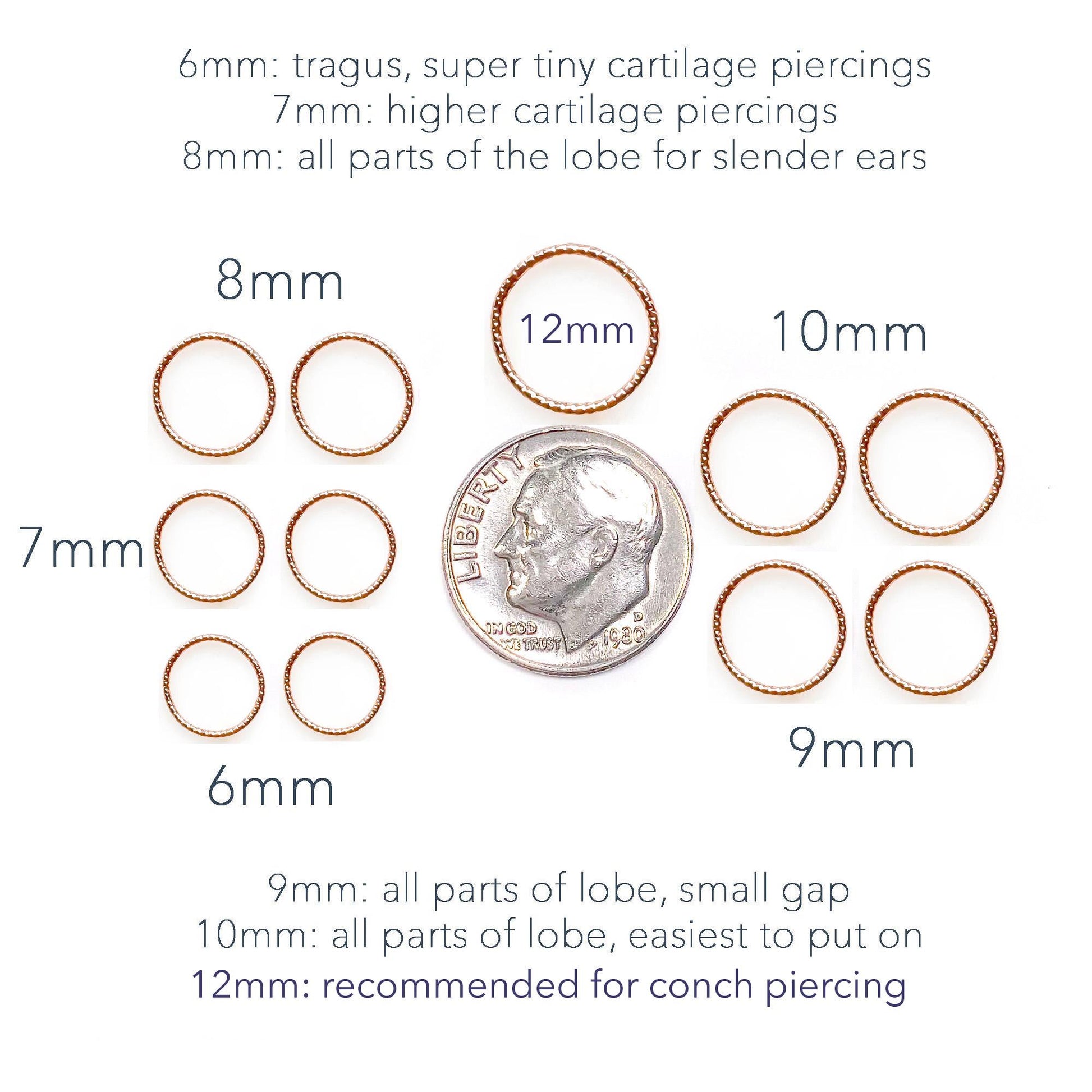 ••7mm: VERY SMALL—usually only for cartilage piercings, or high lobe 2nd or 3rd piercings