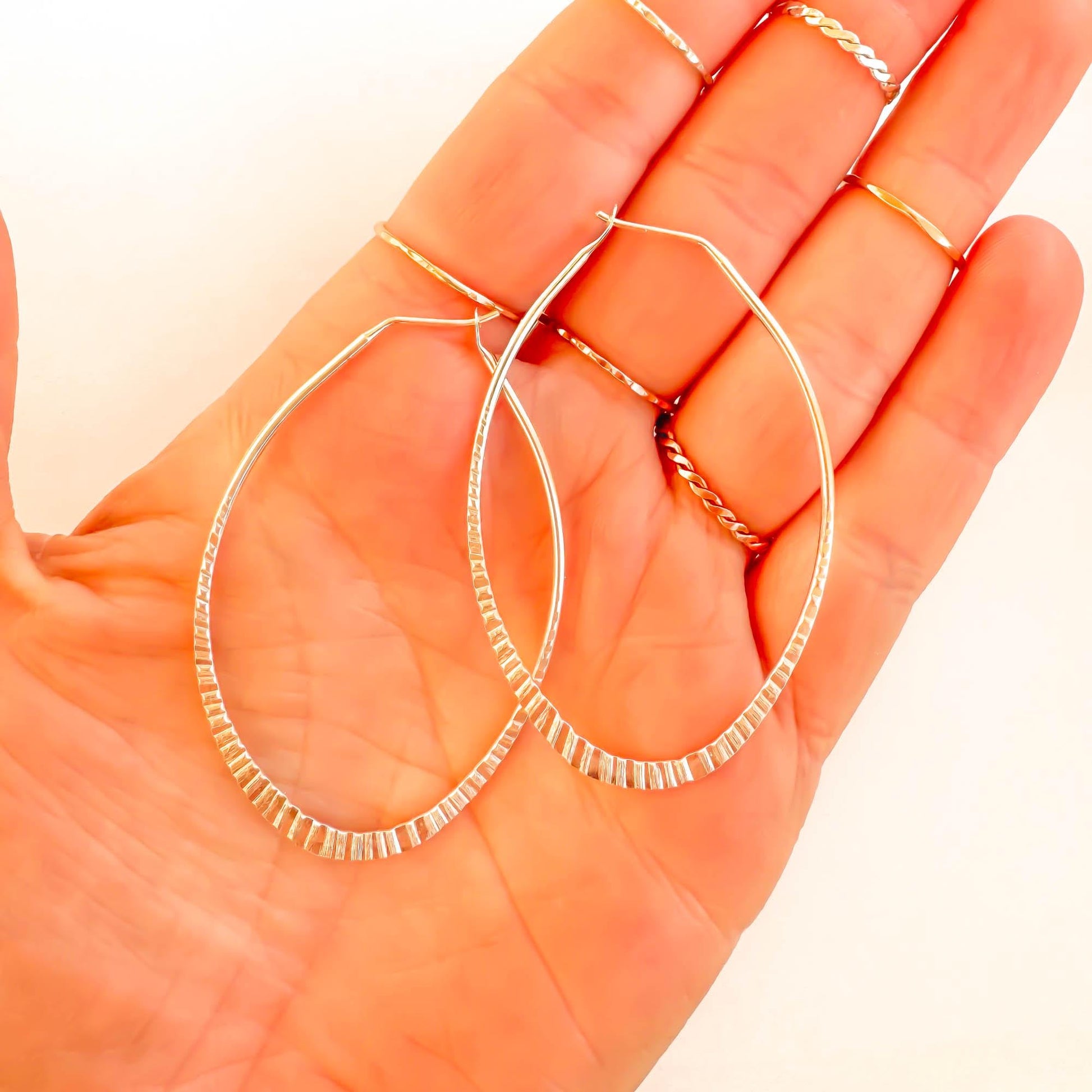 • Hand pressed hammered texture on ONE side of each hoop. Comes as a pair—a left and right side.