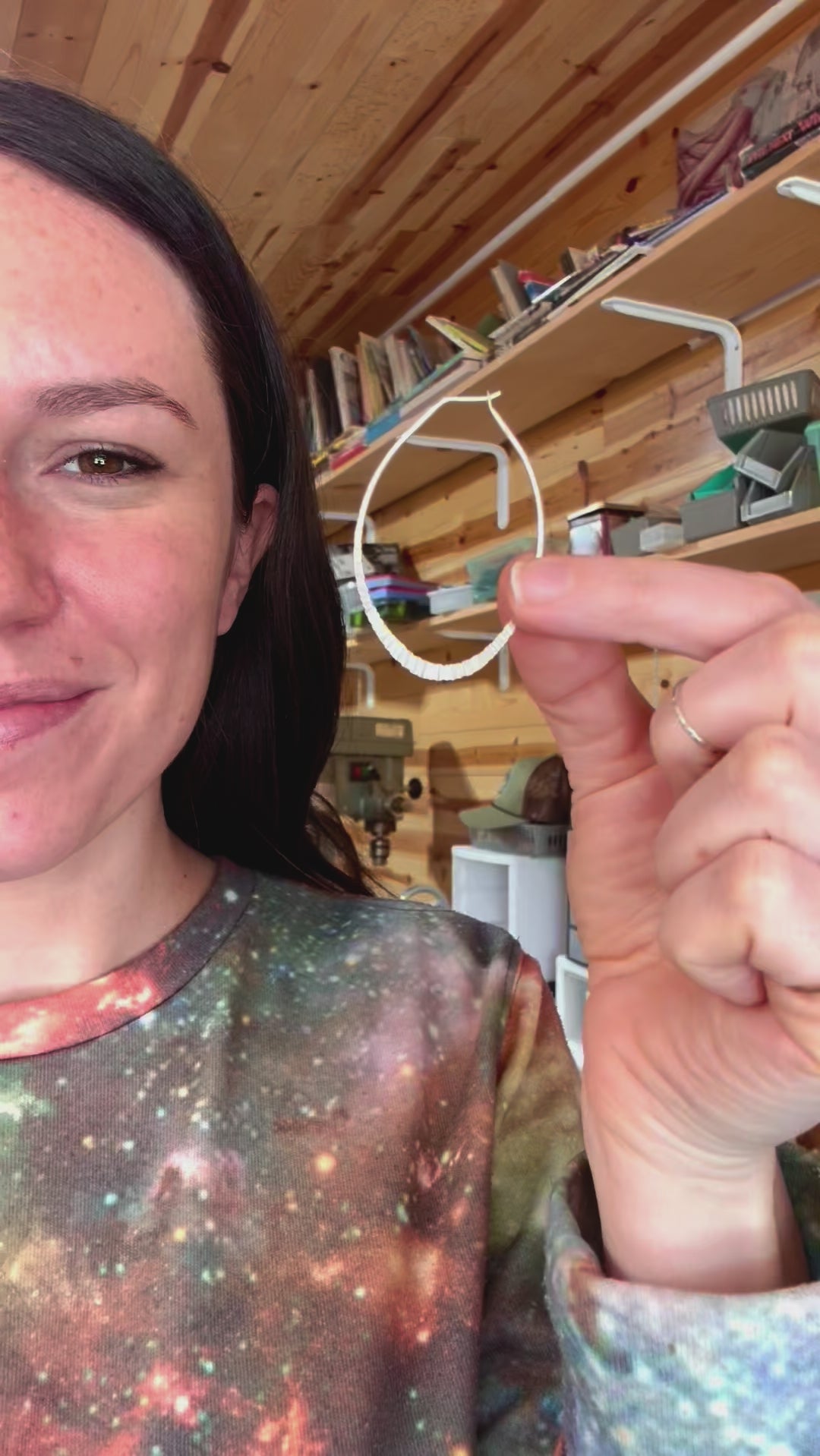 • 16 gauge (1.3mm thick) solid 925 sterling silver wire, with the ends thinned out to about 21 gauge, to easily slip through your ear. There is a latch back, which makes a comfortable backing in a continuous hoop shape.