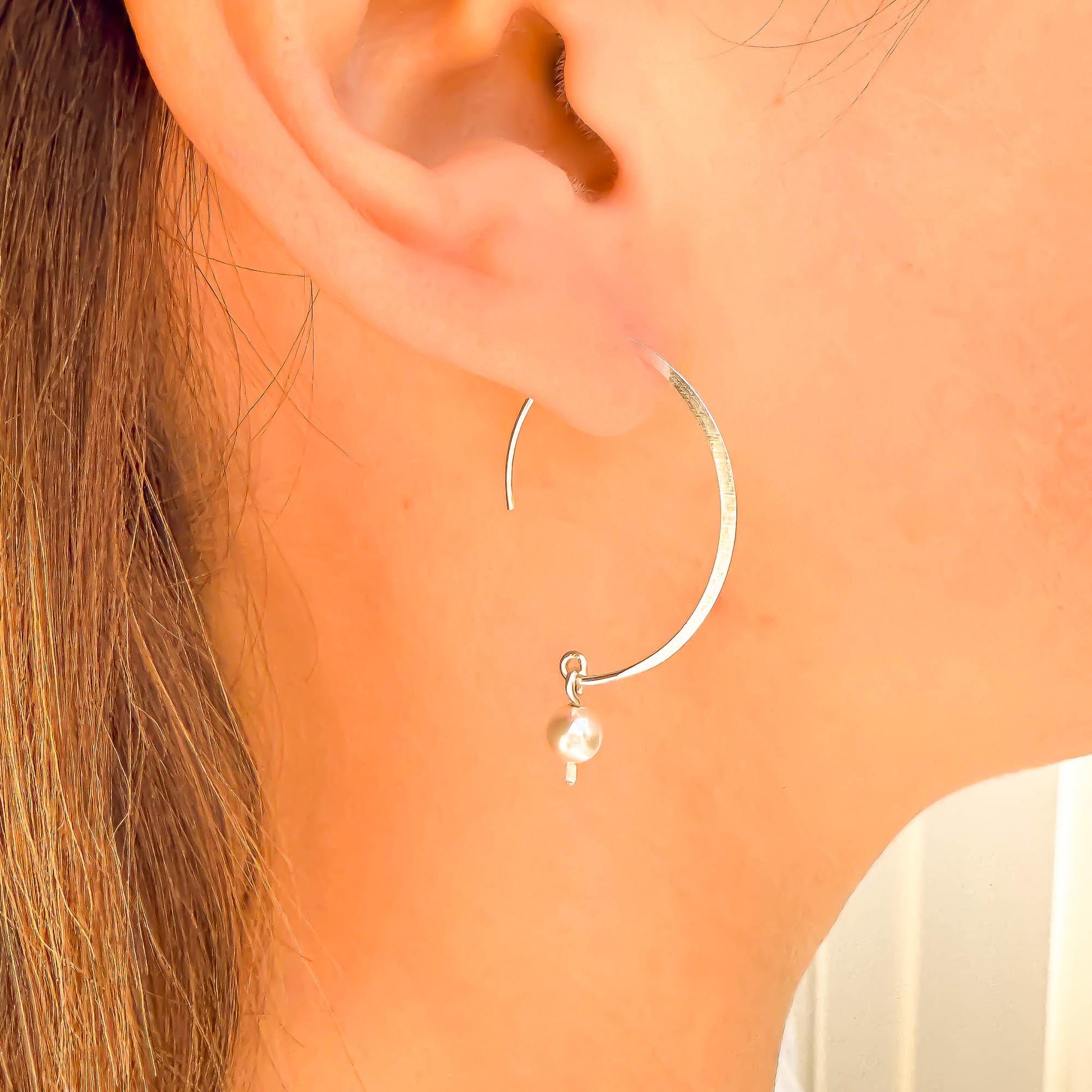 Slide the shorter, round end through the front of your piercing, until the earring is sitting at the "curve" upright in your ear. These earrings traditionally don't require earring backs. But for those with active lifestyles, and if you like a secure fit—we do offer 5mm silicone earring backs upon request. Slide/twist on gently, to preserve the earring's shape.