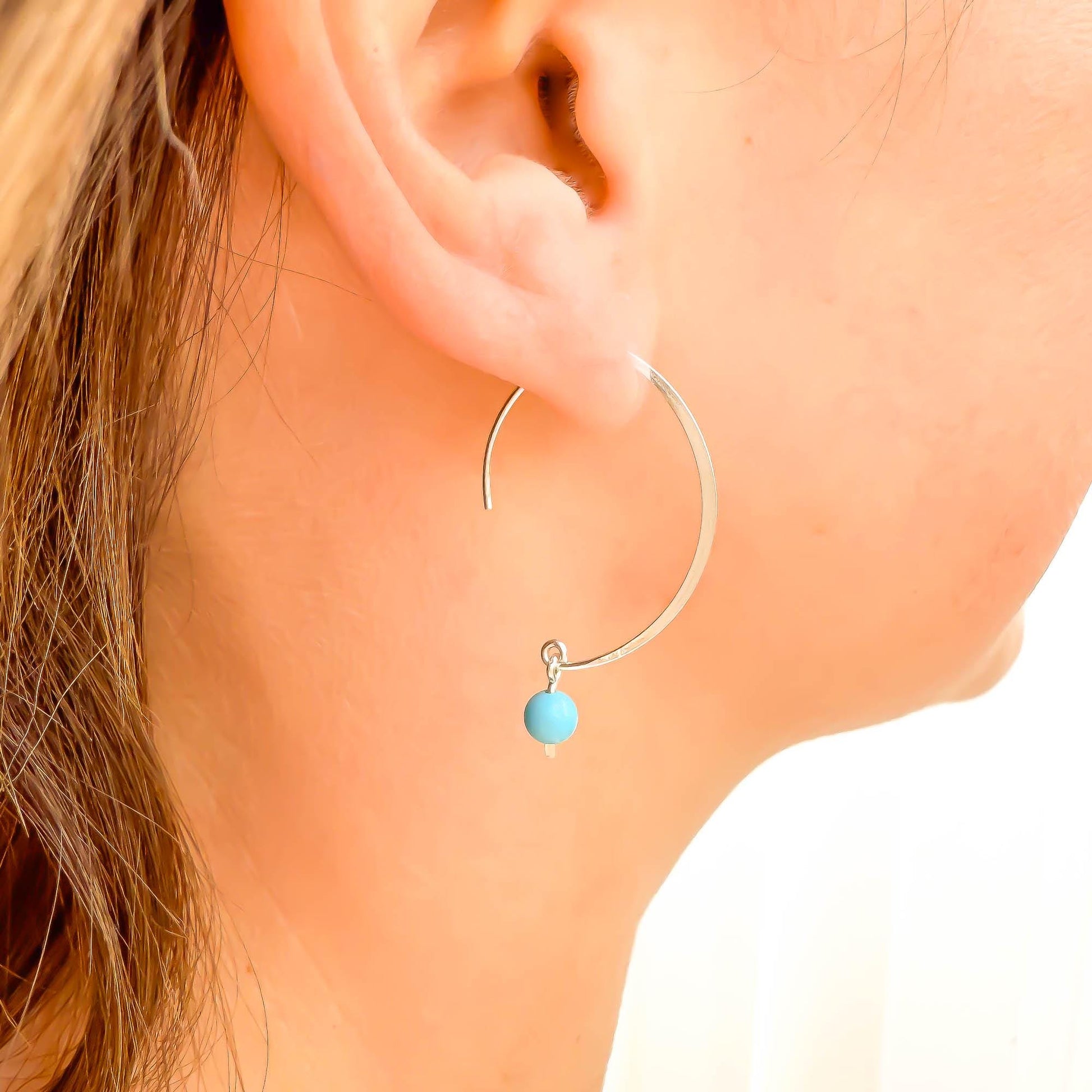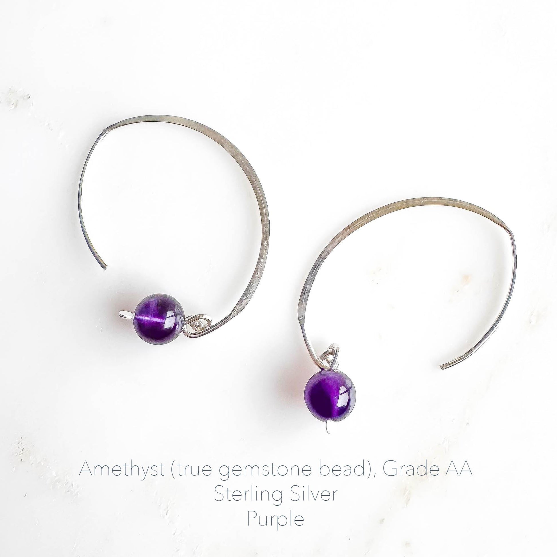 • These handcrafted swoop half hoop earrings, feature brilliant 5mm gemstone beads. Choose between Amethyst (6mm, purple, gemstone), Onyx (6mm, black, gemstone), Pearl (5mm, crystal core, simulated pearl), or Turquoise (5mm, simulated resin/reconstituted).