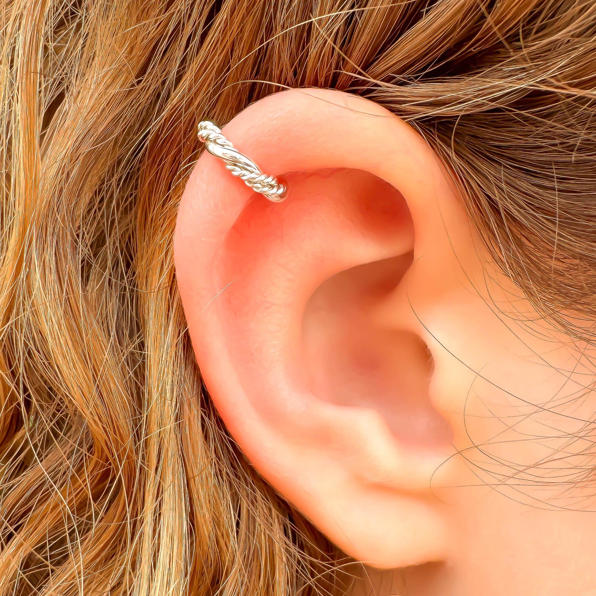 This is a dainty ear cuff in solid sterling silver. It has an elegant, unique interwoven twist design.