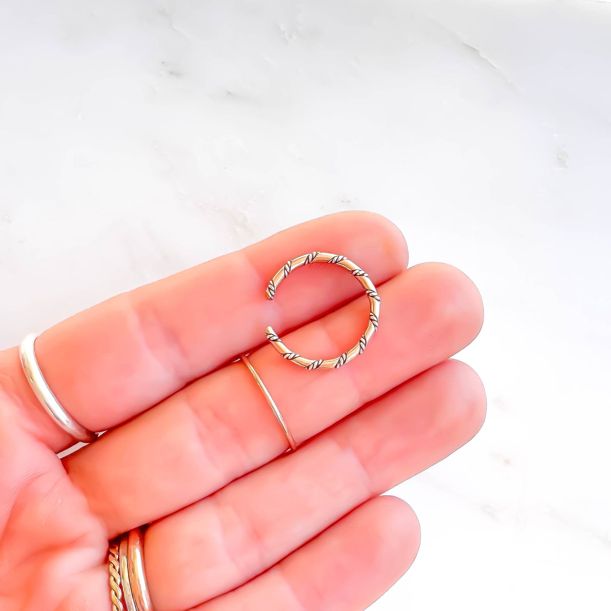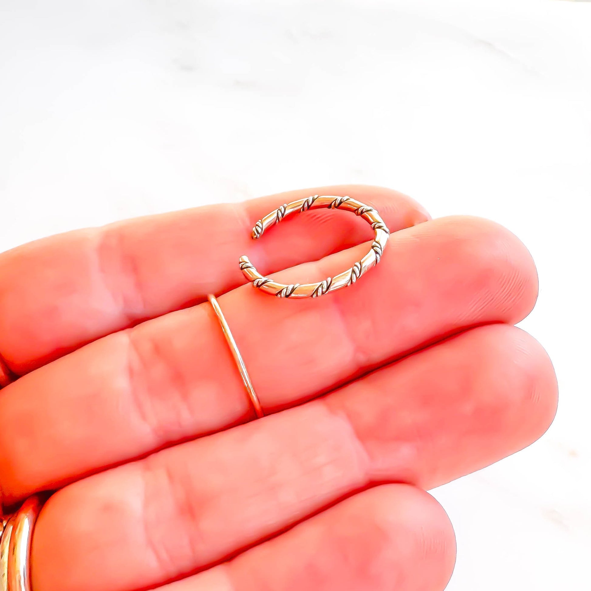 • Made out of 14 gauge 1/2 round 14K rose gold filled wire (1.6mm x .8mm) twisted with 2 strands of twisted 24 gauge round 925 sterling silver wires (each strand .5mm) to make a creative rope like pattern.